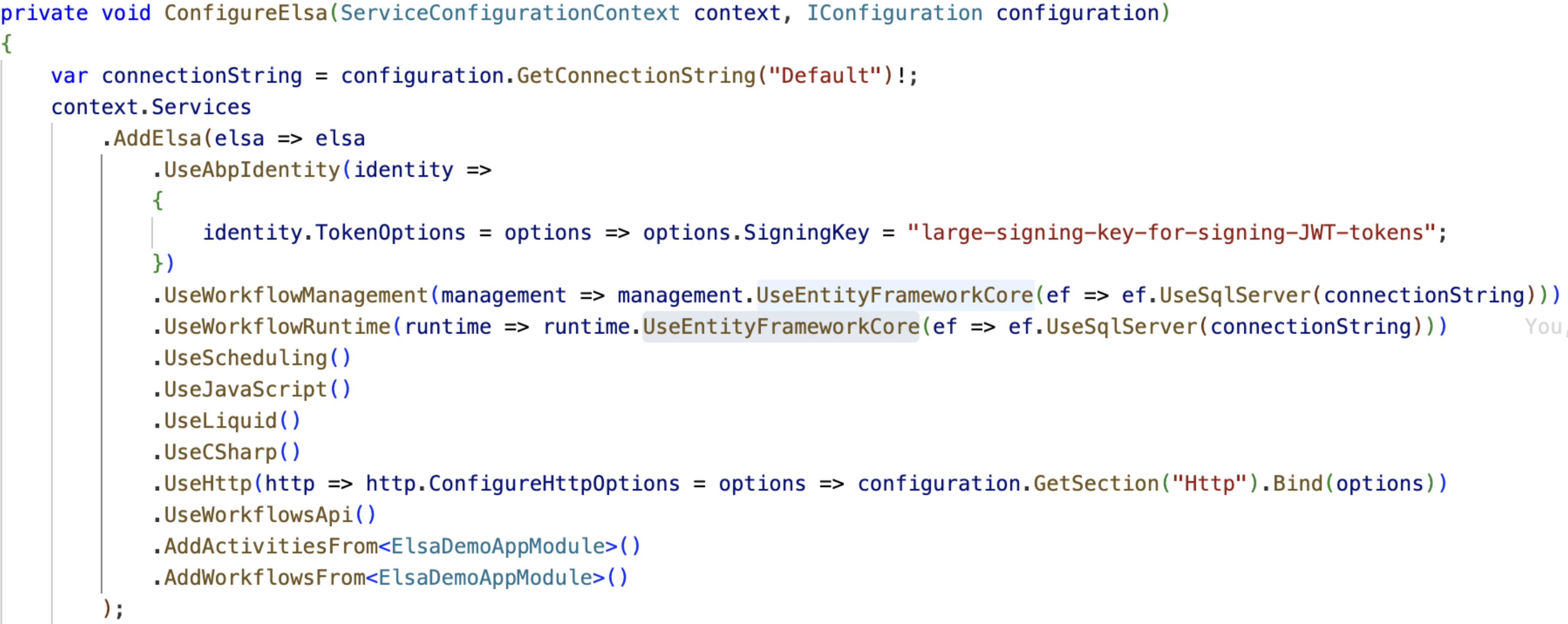 • Configure Elsa EF Core persistence In your Host module’s ConfigureServices: