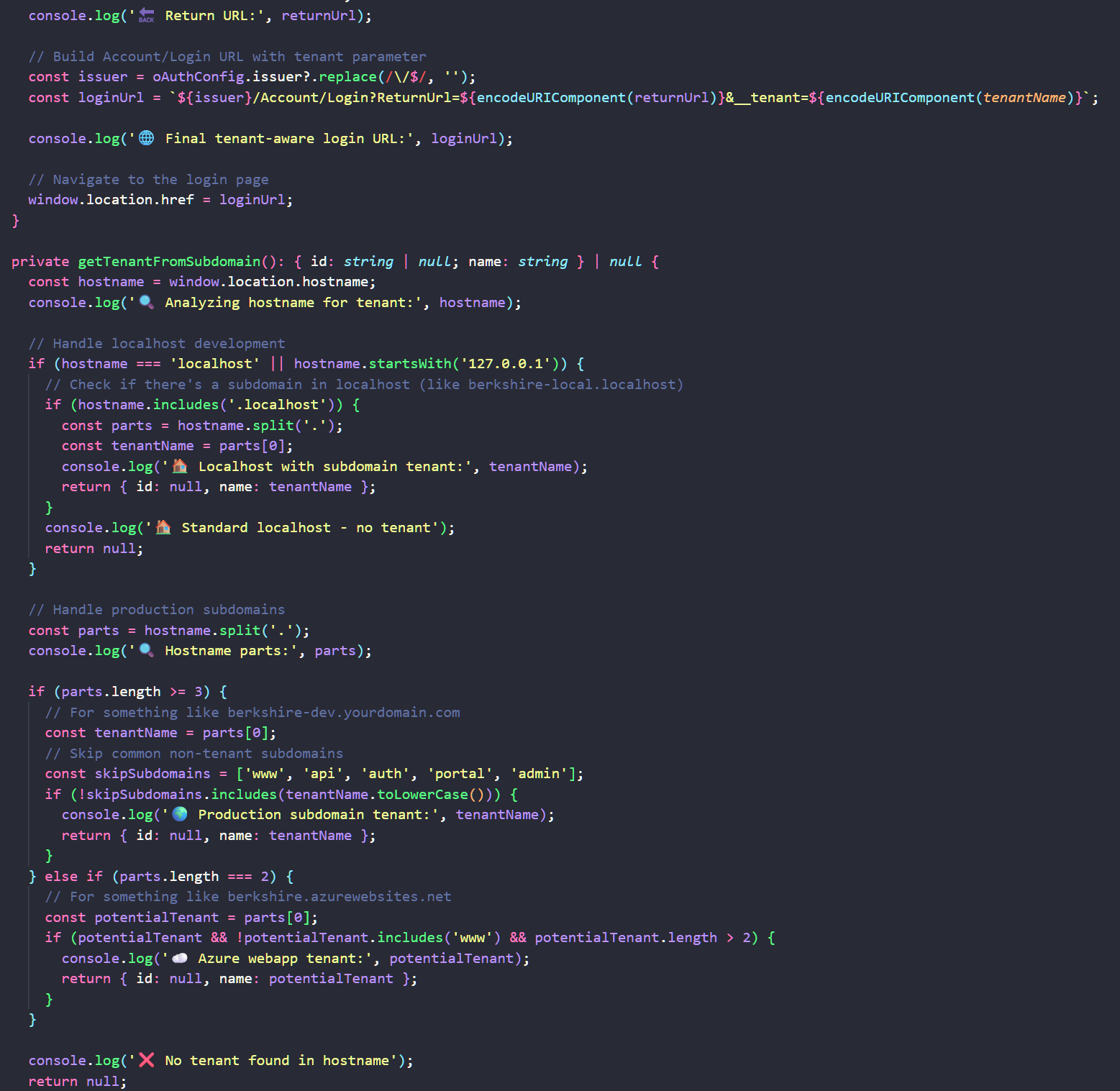 - Do not auto-call login in constructor/ngOnInit before SessionStateService is ready. Use a public landing page and a Login button (or trigger login after ngOnInit once tenant is available). This avoids the redirect loop you observed when redirecting to dashboard immediately.