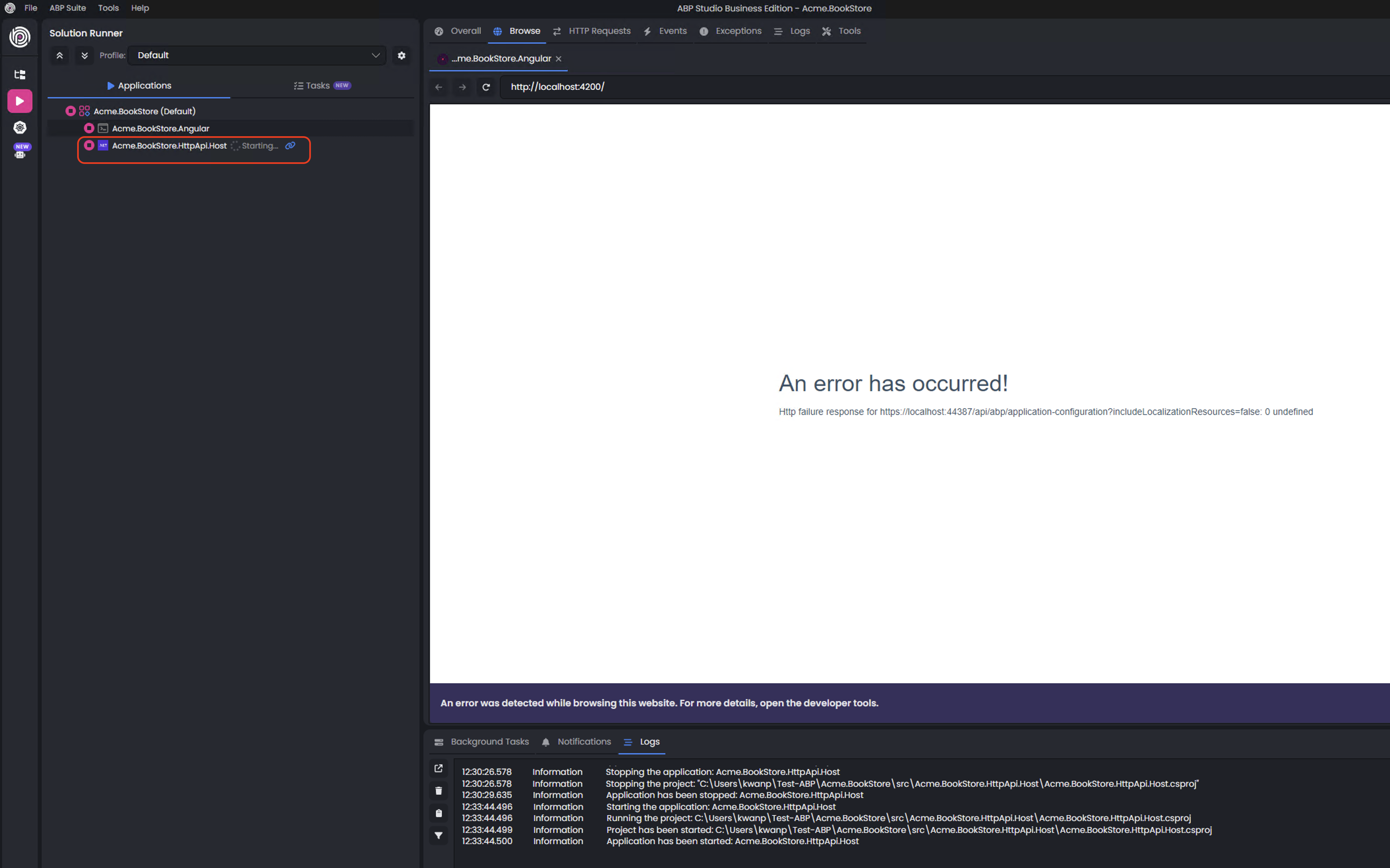 - Solution Based on your screenshot and the “Http failure response for https://localhost:xxxxx/api/abp/application-configuration?includeLocalizationResources=false” message in the Angular tab while HttpApiHost is stuck on “Starting…”, the Angular app can’t reach a healthy backend. In ABP Angular, the first call is always to /api/abp/application-configuration; if it fails, the UI shows that error.