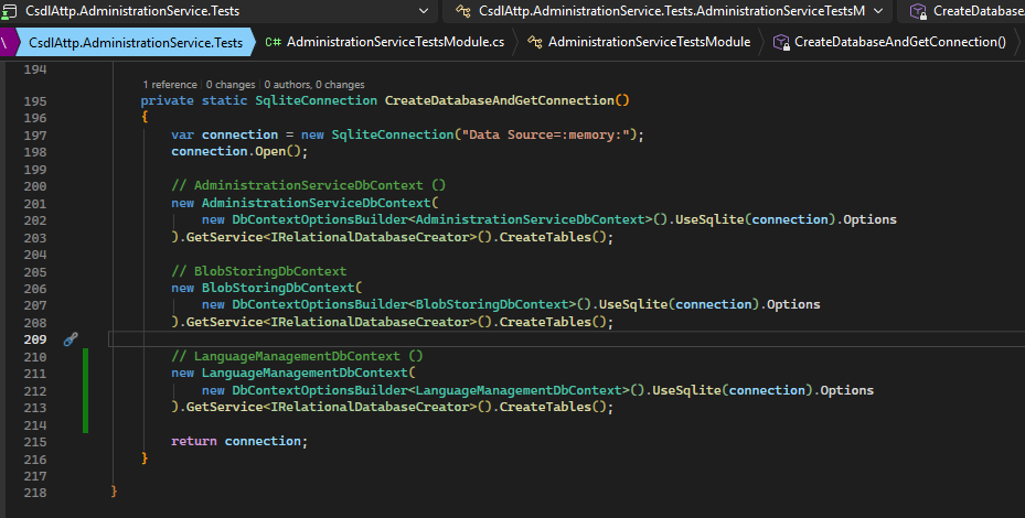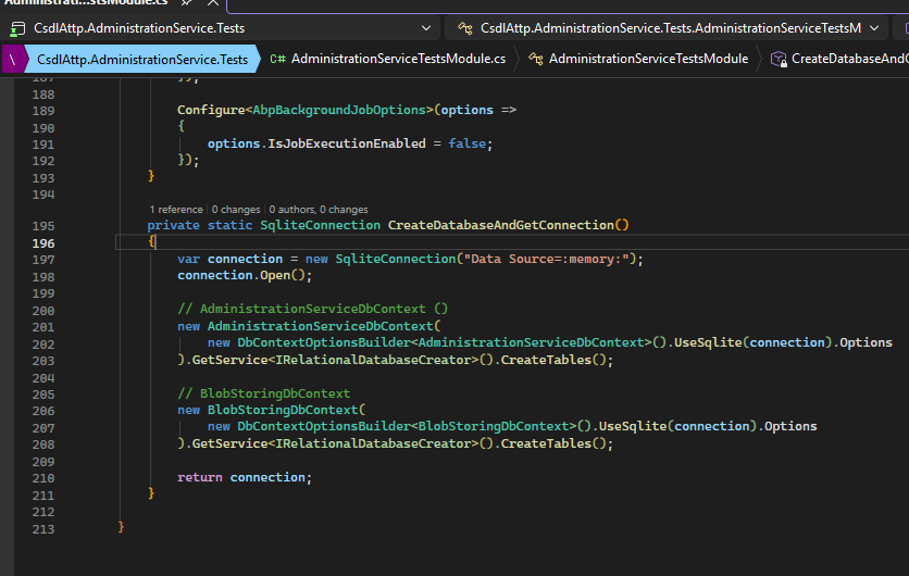 CreateDatabaseAndGetConnectionas belowprivate static SqliteConnection CreateDatabaseAndGetConnection() { var connection = new SqliteConnection("Data Source=:memory:"); connection.Open(); // AdministrationServiceDbContext () new AdministrationServiceDbContext( new DbContextOptionsBuilder<AdministrationServiceDbContext>().UseSqlite(connection).Options ).GetService<IRelationalDatabaseCreator>().CreateTables(); // BlobStoringDbContext new BlobStoringDbContext( new DbContextOptionsBuilder<BlobStoringDbContext>().UseSqlite(connection).Options ).GetService<IRelationalDatabaseCreator>().CreateTables(); // LanguageManagementDbContext () new LanguageManagementDbContext( new DbContextOptionsBuilder<LanguageManagementDbContext>().UseSqlite(connection).Options ).GetService<IRelationalDatabaseCreator>().CreateTables(); return connection; }Thanks.