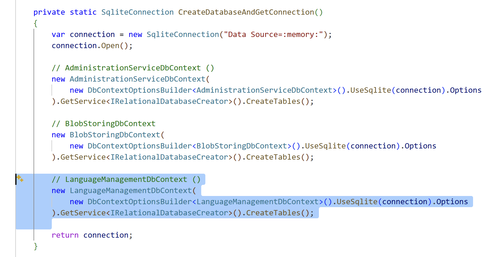 - In your test module where you configure the in‑memory SQLite connection, configure the same connection for LanguageManagementDbContext and create its tables using IRelationalDatabaseCreator.CreateTables().