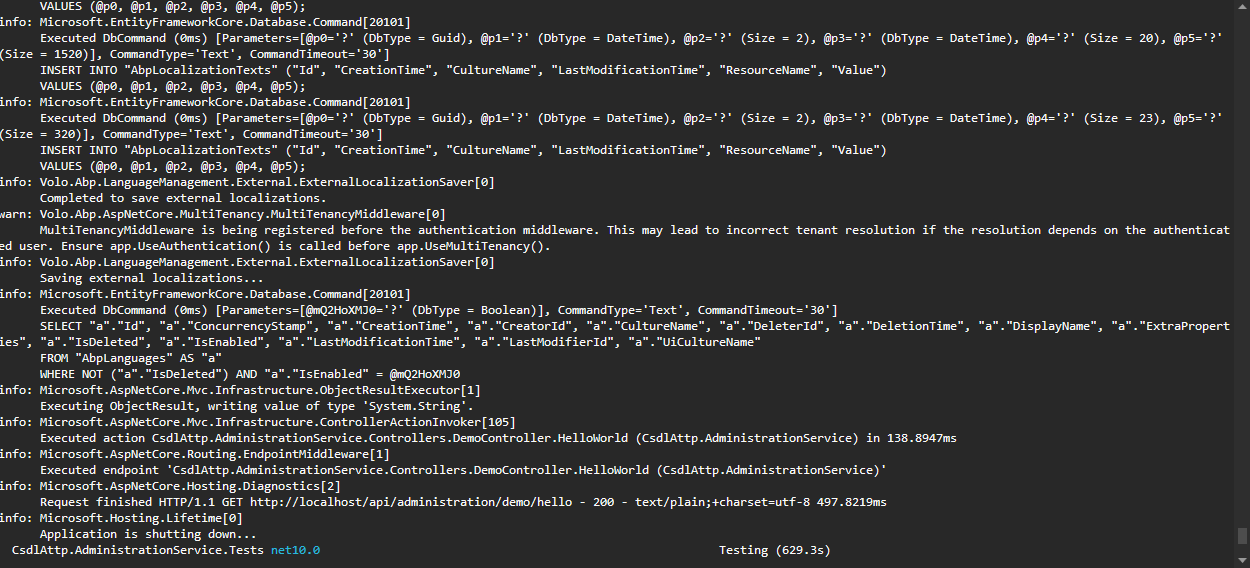 Hello maliming, I followed your instructions. After running dotnet test, the errors related to the missing AbpLanguages and AbpLanguageTexts tables were resolved. However, the testing process is now taking a very long time and continues running without producing any results.