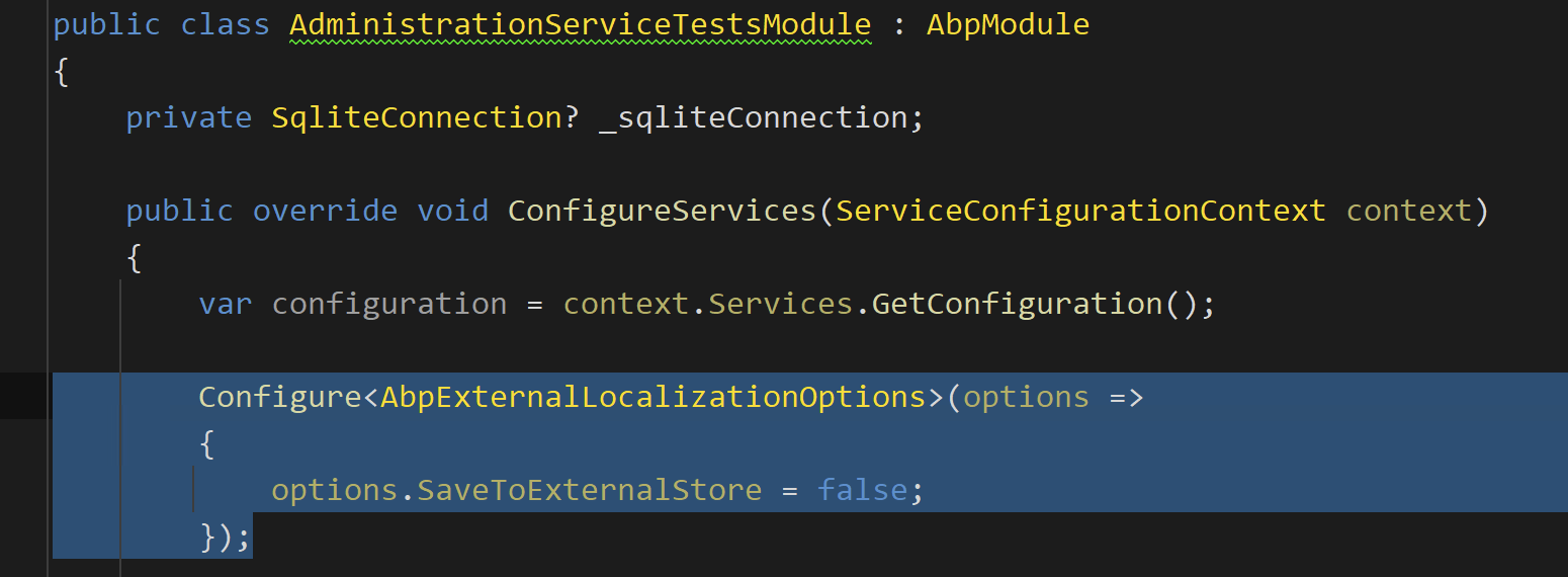 using Microsoft.Data.Sqlite; using Microsoft.EntityFrameworkCore; using Microsoft.EntityFrameworkCore.Infrastructure; using Microsoft.EntityFrameworkCore.Storage; using Microsoft.Extensions.DependencyInjection; using Volo.Abp.EntityFrameworkCore; using Volo.Abp.Modularity; using Volo.Abp.LanguageManagement.EntityFrameworkCore; [DependsOn( typeof(AdministrationServiceEntityFrameworkCoreModule), typeof(AbpEntityFrameworkCoreSqliteModule), typeof(AbpLanguageManagementEntityFrameworkCoreModule) // add this )] public class AdministrationServiceEntityFrameworkCoreTestModule : AbpModule { public override void ConfigureServices(ServiceConfigurationContext context) { var sqliteConnection = CreateDatabaseAndGetConnection(); Configure<AbpDbContextOptions>(options => { options.Configure<AdministrationServiceDbContext>(c => { c.DbContextOptions.UseSqlite(sqliteConnection); }); options.Configure<BlobStoringDbContext>(c => { c.DbContextOptions.UseSqlite(sqliteConnection); }); // configure LanguageManagementDbContext to use the same connection options.Configure<LanguageManagementDbContext>(c => { c.DbContextOptions.UseSqlite(sqliteConnection); }); }); } private static SqliteConnection CreateDatabaseAndGetConnection() { var connection = new SqliteConnection("Data Source=:memory:"); connection.Open(); // AdministrationService new AdministrationServiceDbContext( new DbContextOptionsBuilder<AdministrationServiceDbContext>().UseSqlite(connection).Options ).GetService<IRelationalDatabaseCreator>().CreateTables(); // BlobStoring new BlobStoringDbContext( new DbContextOptionsBuilder<BlobStoringDbContext>().UseSqlite(connection).Options ).GetService<IRelationalDatabaseCreator>().CreateTables(); // LanguageManagement: creates AbpLanguages, AbpLanguageTexts, etc. new LanguageManagementDbContext( new DbContextOptionsBuilder<LanguageManagementDbContext>().UseSqlite(connection).Options ).GetService<IRelationalDatabaseCreator>().CreateTables(); return connection; } }- Notes