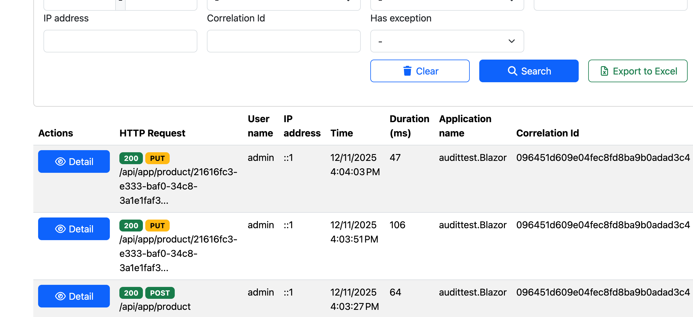 - Get/List (GET) may still appear in logs depending on AbpAuditingOptions (e.g., IsEnabledForGetRequests=true);
