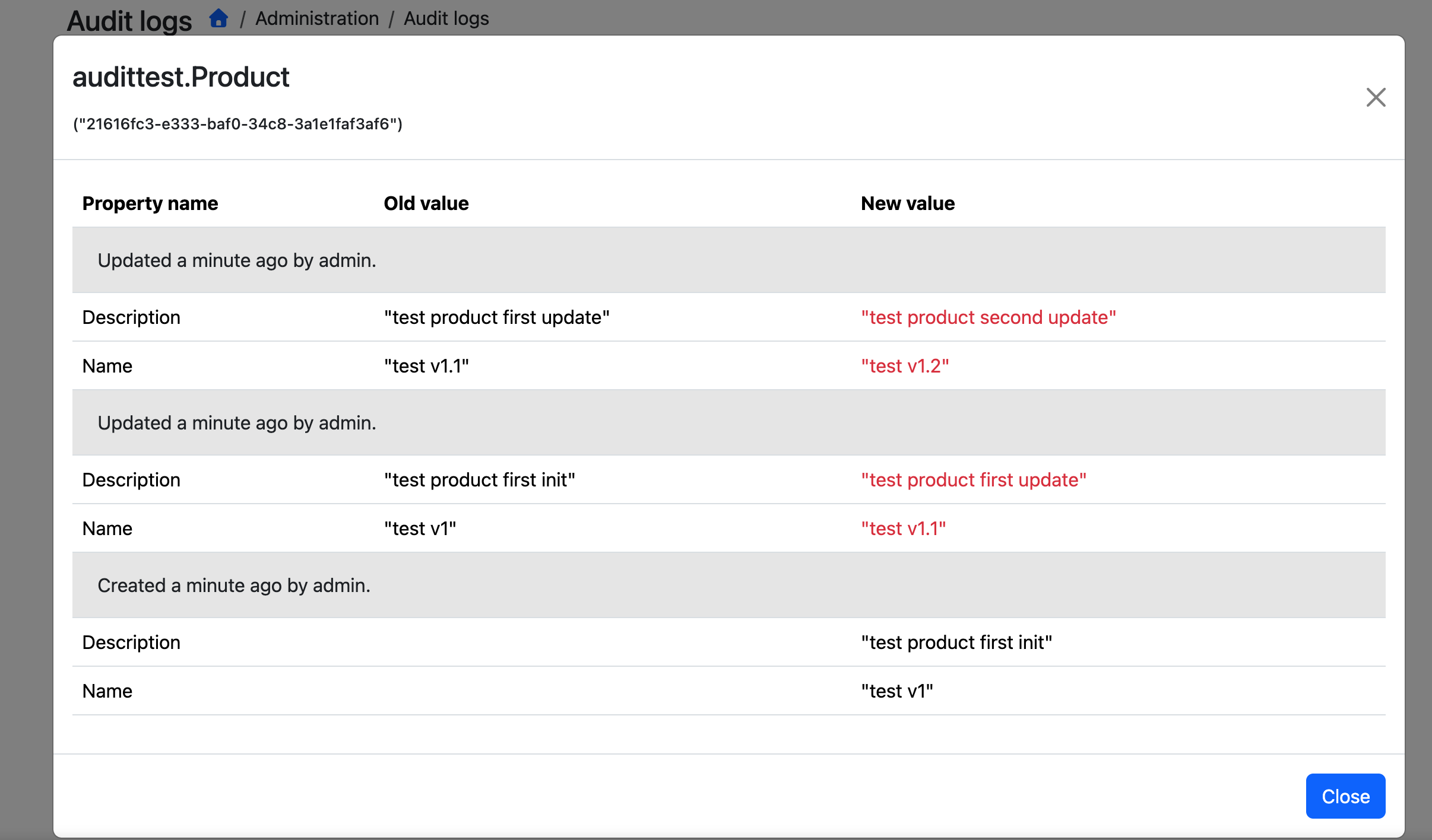 DeleteAsync(Guid id): Works perfectly. Audit log creates, Entity Change records are inserted.