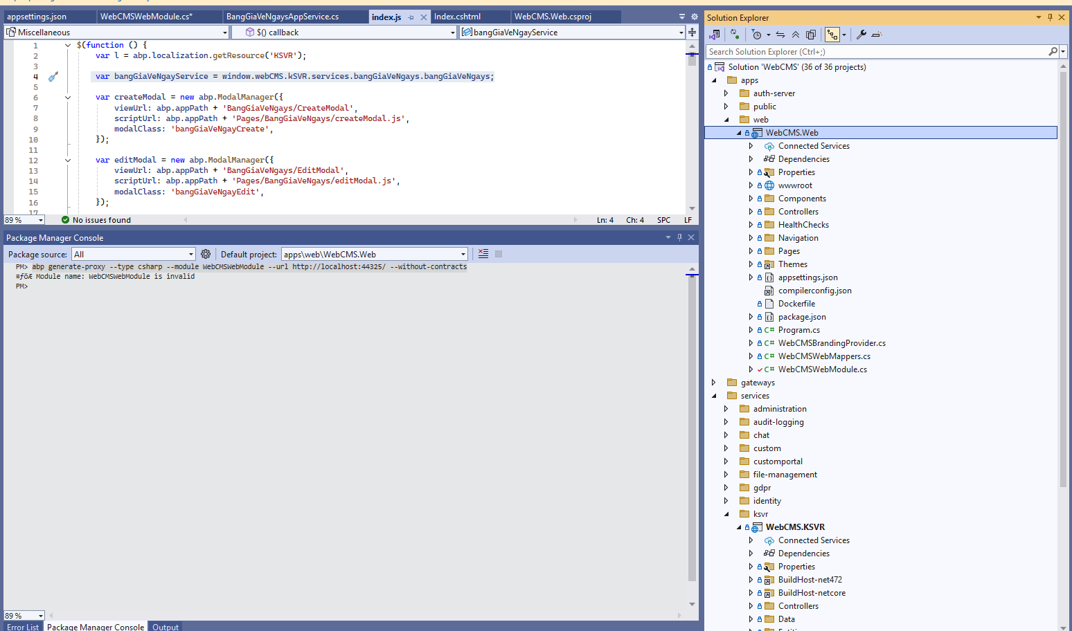 1. Solution In recent ABP versions, the static JavaScript API proxy global namespace and loading flow have changed. The old pattern like: var bangGiaVeNgayService = window.webCMS.kSVR.services.bangGiaVeNgays.bangGiaVeNgays; will no longer work unless your solution defines the same global namespace and generates the proxies into it.