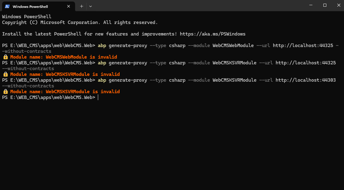 Hi Maliming, Every time I make changes to the KSVR service, I have to run the command abp generate-proxy --type csharp --module ksvr --url http://localhost:44303 --without-contracts to regenerate the Client Proxies. Is there any way to generate them automatically whenever changes are made, or is it mandatory to run the command manually?
