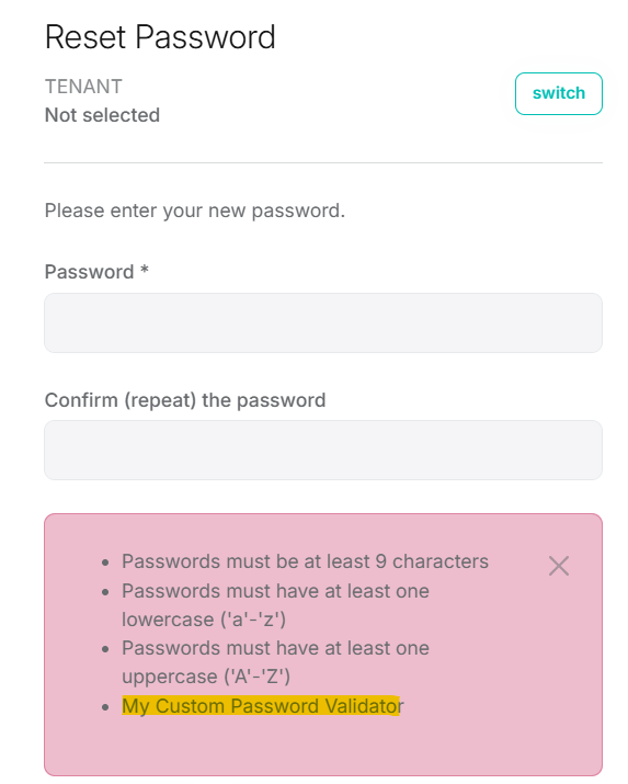 using System.Threading.Tasks; using Microsoft.AspNetCore.Identity; using Volo.Abp.DependencyInjection; using Volo.Abp.Identity; public class MyPasswordValidator : IPasswordValidator<IdentityUser>, ITransientDependency { public Task<IdentityResult> ValidateAsync(UserManager<IdentityUser> manager, IdentityUser user, string password) { var errors = new List<IdentityError>(); // Example: built-in checks are already configured by IdentityOptions. // Add your own custom rule: if (password?.Contains("my-disallowed-fragment", StringComparison.OrdinalIgnoreCase) == true) { errors.Add(new IdentityError { Code = "MyCustomPasswordRule", Description = "My custom password validation error message." }); } return Task.FromResult(errors.Count == 0 ? IdentityResult.Success : IdentityResult.Failed(errors.ToArray())); } }- Register your validator:
