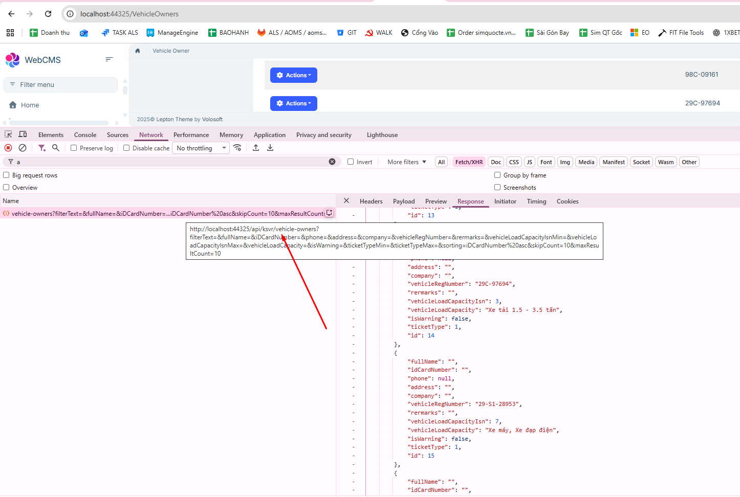 const res = await fetch('http://localhost:44303/api/ksvr/vehicle-owners/lookup/autocomplete?keyword=29', { method: 'GET', headers: { 'Authorization': `Bearer ${accessToken}`, 'X-Requested-With': 'XMLHttpRequest' // 'RequestVerificationToken': csrfToken // if needed in your setup // 'Abp-Tenant': tenantName // if multi-tenant by name }, credentials: 'include' });Why your other API works while autocomplete doesn’t