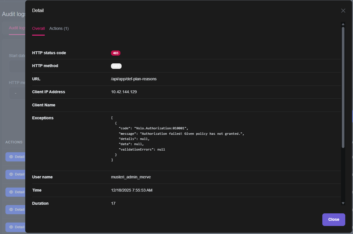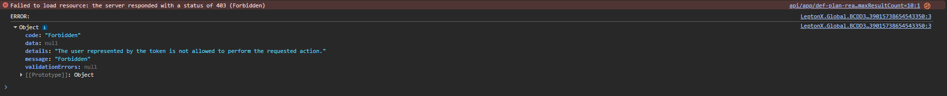 Actually, you can reproduce this error yourself. Open a page within an ABP application using two different browsers. Log in as admin on one browser and as user on the other. Open the page related to the user and leave it open. From the other browser, remove the permission for the relevant page from the user's role using the admin. Make a list request on the user's open page so you can see the error. How can we localize this error?