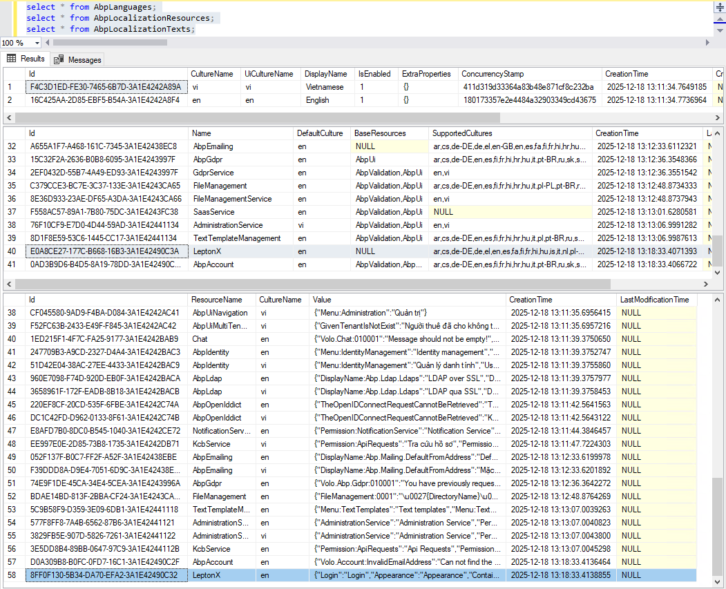 - Since you enabled Dynamic Localization, ABP reads languages/resources from DB too. Ensure AbpLanguages table has at least vi and en with CultureName and UiCultureName set, and that nothing writes an empty language row.