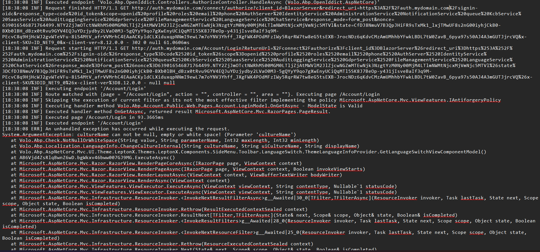 - Solution Based on your stack trace, the failure happens while rendering the LeptonX theme’s language switch on the AuthServer login page: Volo.Abp.Localization.LanguageInfo.ChangeCultureInternal(String cultureName, String uiCultureName, String displayName) LeptonX.Components.SideMenu.Toolbar.LanguageSwitch.ThemeLanguageInfoProvider.GetLanguageSwitchViewComponentModel()