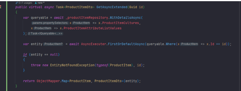 public virtual async Task<ProductItemDto> GetAsync(Guid id) { var queryable = await _productItemRepository.WithDetailsAsync( x => x.ProductItemCultures, x => x.ProductItemAttributeListValues ); var entity = await AsyncExecuter.FirstOrDefaultAsync(queryable.Where(x => x.Id == id)); if (entity == null) { throw new EntityNotFoundException(typeof(ProductItem), id); } return ObjectMapper.Map<ProductItem, ProductItemDto>(entity); }- Option B: Expose includeDetails on repository Get/Find