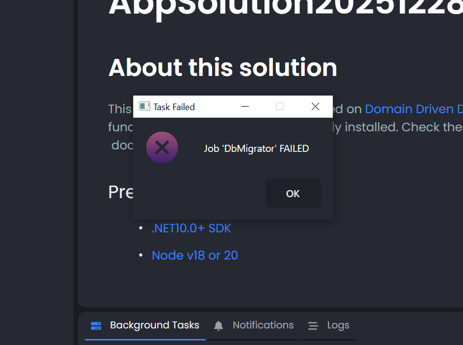 Checking pre-requirementsInstalling/using ABP Studio CLIJob 'DbMigrator'Opening ABP Suite
