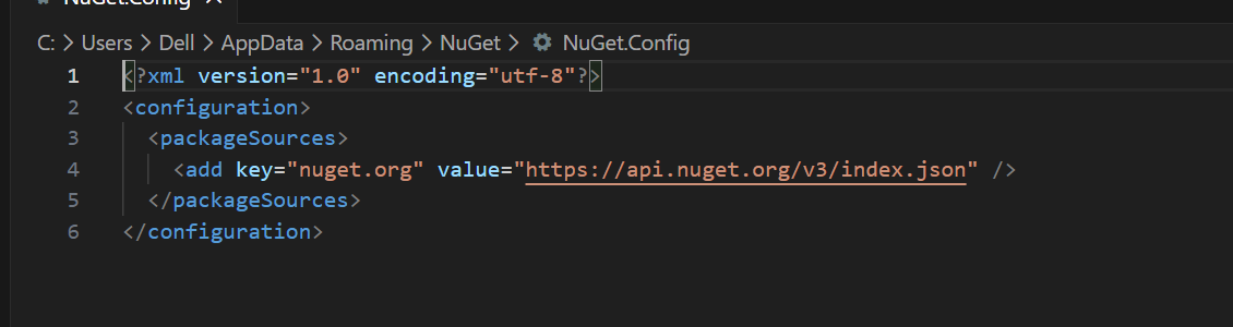 https://api.nuget.org/v3/index.jsonexists and is enabled as a source.Save the file.