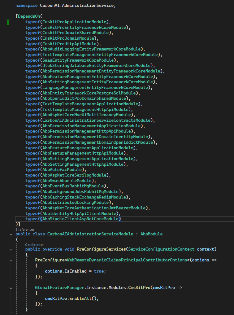 - Create Command: abp new CarbonAI -t microservice --ui-framework angular --mobile react-native --database-provider ef --database-management-system postgresql --theme leptonx --skip-migrator --public-website --without-cms-kit --aspire --dont-run-bundling -no-language-management -file-management