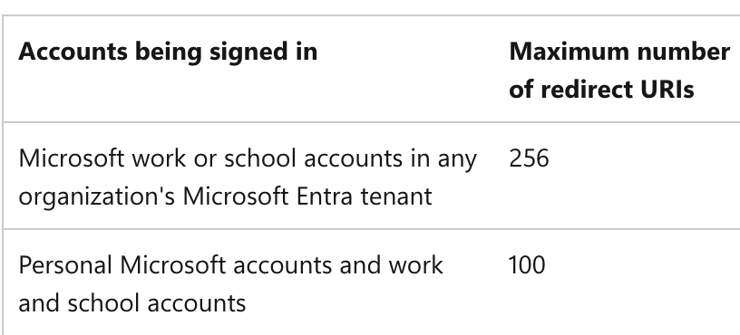 https://learn.microsoft.com/en-us/entra/identity-platform/reply-url#maximum-number-of-redirect-uris-and-uri-length https://learn.microsoft.com/en-us/entra/identity-platform/reply-url#restrictions-on-wildcards-in-redirect-uris