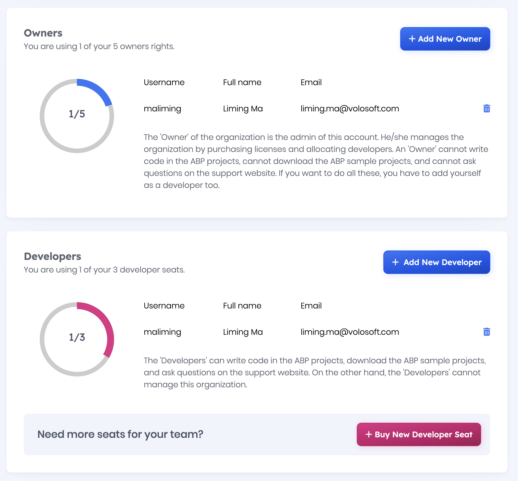 We want to remove the 'blazorise free version' bar at the bottom of our appliction. We are trying to get the blazorise product-token that is needed for that, but after logging in on the blazorise website (with the same emailaddress as we use for abp.io) we don't see that information in our blazorise profile page 'my license'. We have contacted blazorise but they say that, using the API call at their disposal for this, they don't get an active ABP license for our email-address. We have two organizations, the 'default' organization's license is active and runs to june '26, the other organization's license is expired. For some reason the API does not return the active/default organization's license.