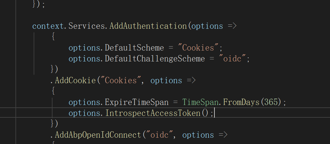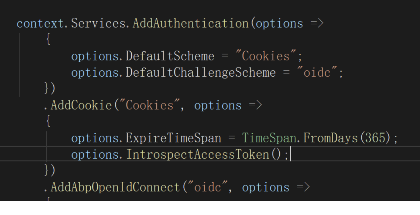 options.IntrospectAccessToken()is an ABP helper extension for cookie authentication:context.Services.AddAuthentication(options => { options.DefaultScheme = "Cookies"; options.DefaultChallengeScheme = "oidc"; }) .AddCookie("Cookies", options => { options.ExpireTimeSpan = TimeSpan.FromDays(365); options.IntrospectAccessToken(); // = old helper }) .AddAbpOpenIdConnect("oidc", options => { // ... });From the ABP source: