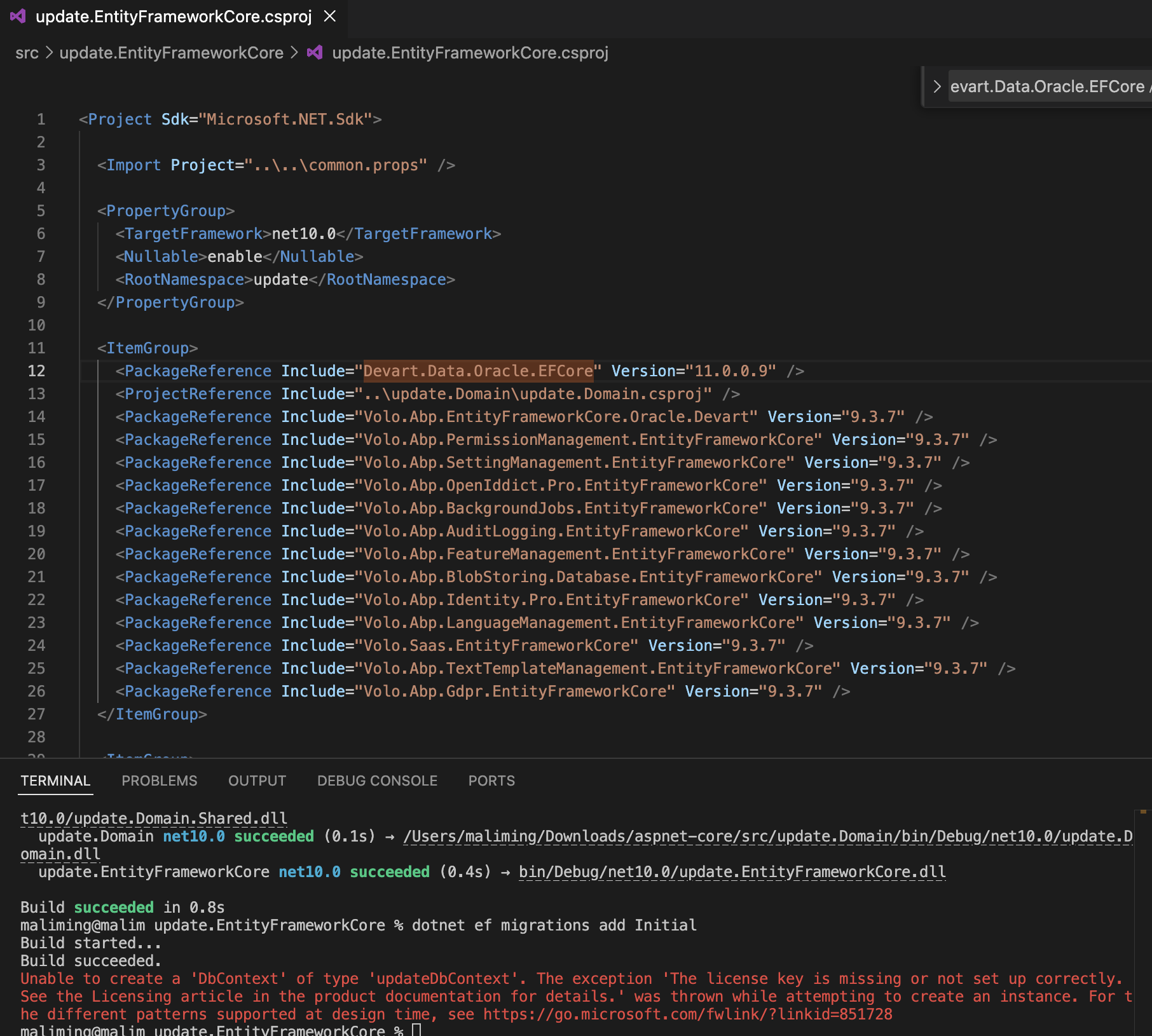 I’m experiencing a critical issue when running EF Core migrations on macOS (Apple Silicon) using ABP v9 with the Devart Oracle provider.