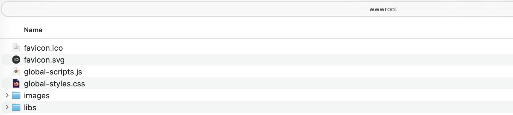 favicon.ico favicon.svgfiles as embedded resources.<ItemGroup> <EmbeddedResource Include="wwwroot\**\*.ico" /> <EmbeddedResource Include="wwwroot\**\*.svg" /> <Content Remove="wwwroot\**\*.ico" /> <Content Remove="wwwroot\**\*.svg" /> </ItemGroup>Thanks