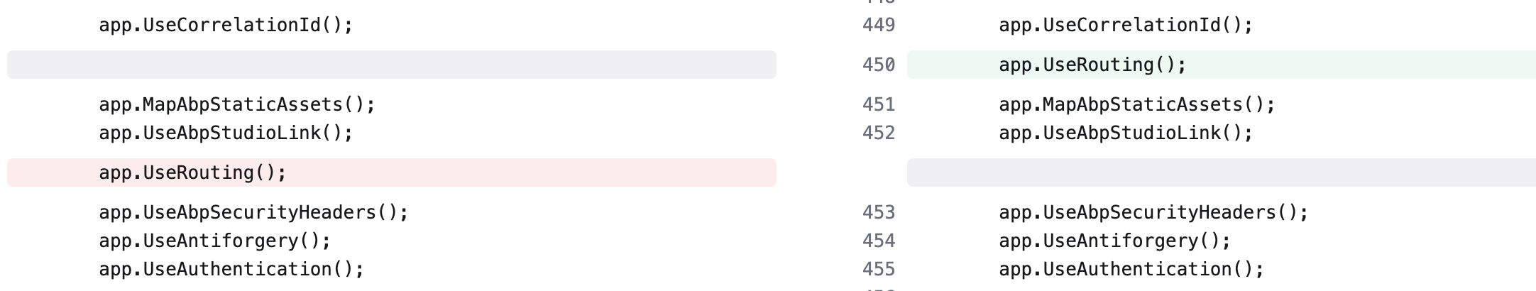 app.UseCorrelationId(); app.MapAbpStaticAssets(); app.UseAbpStudioLink(); app.UseRouting();In the new version