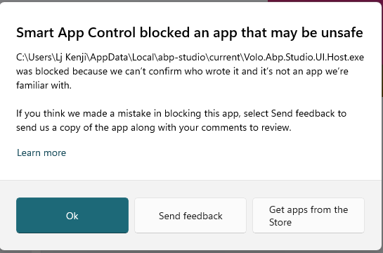 When launching the file Volo.App.Studio.UI.Host.exe from the directory C:\Users[User]\AppData\Local\abp-studio\current, the application is blocked by Windows Smart App Control Error message: "Smart App Control blocked an app that may be unsafe" Blocking reason: "we can't vouch for it and it's not an app we're familiar with" When clicking the "Ok" button, the notification window closes and the application fails to launch I am currently unable to use ABP Studio at all System Information: