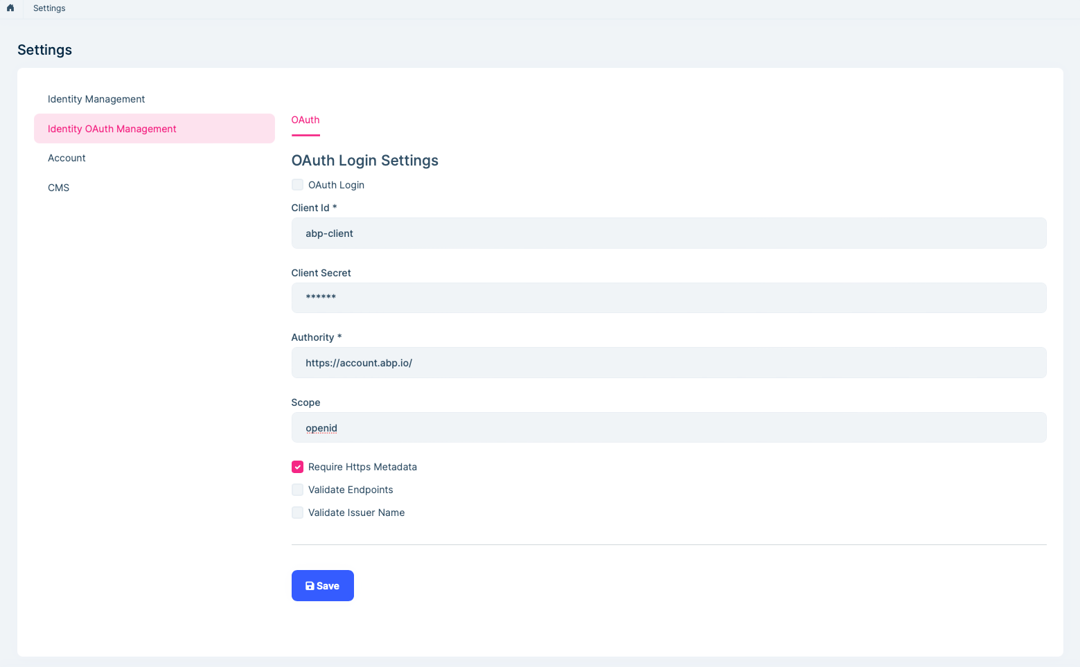 - OAuth configuration must be tenant-based, so each tenant can manage its own Azure AD OAuth settings. I am using Azure AD as the external provider.