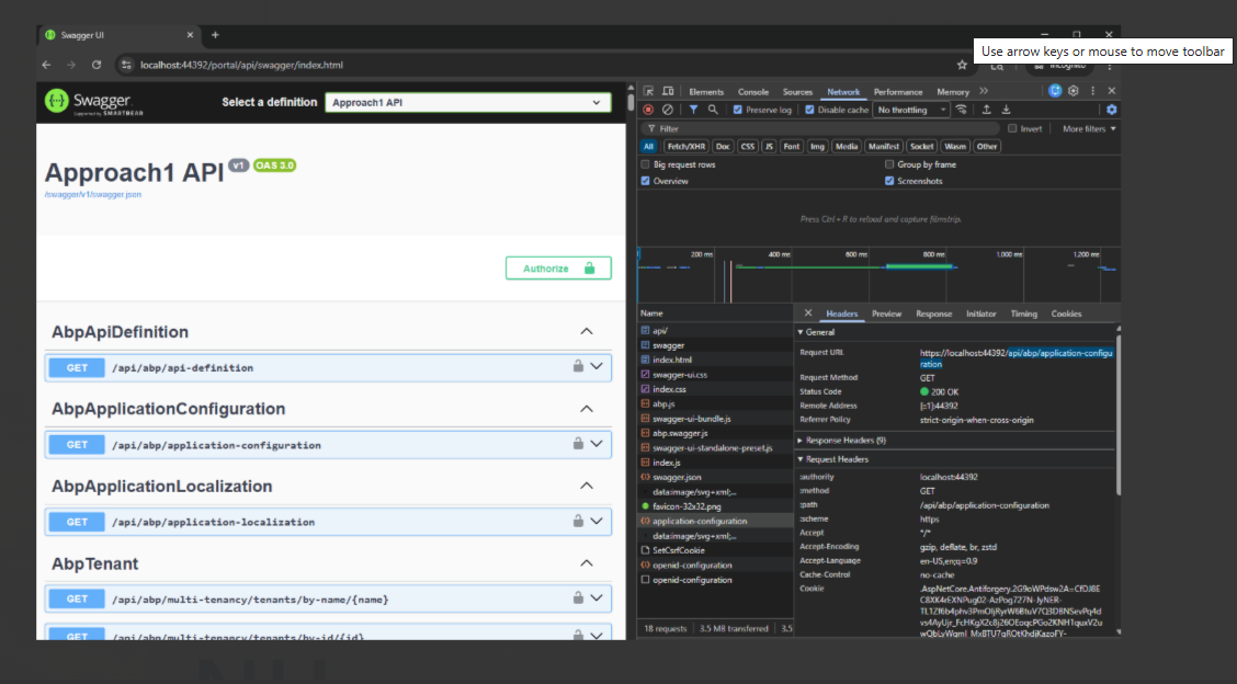 var builder = new StringBuilder(options.HeadContent); builder.AppendLine($"<myscript>abp.appPath = '/portal/api/';</myscript>"); options.HeadContent = builder.ToString(); options.OAuthClientId("Approach_Swagger"); options.OAuthScopes("openid", "profile", "email", "roles", "Approach"); options.OAuth2RedirectUrl("https://localhost:44392/portal/api/swagger/oauth2-redirect.html");});` will send you update soon
