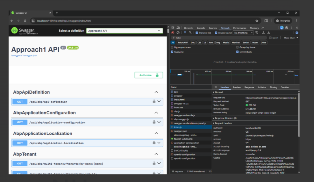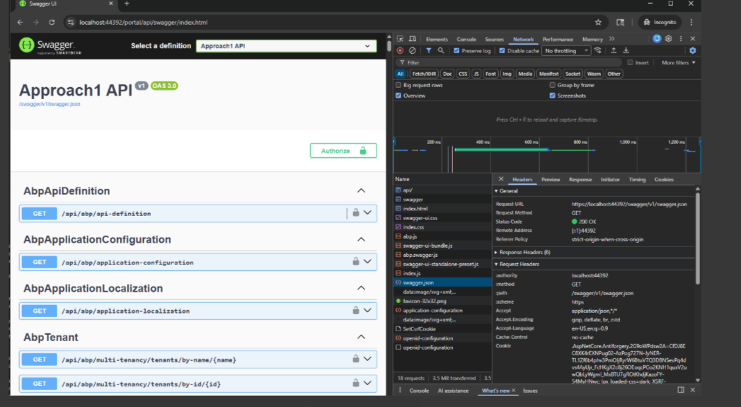 app.UseSwagger(); app.UseAbpSwaggerUI(options => { options.SwaggerEndpoint("/swagger/v1/swagger.json", "Approach API"); var configuration = context.GetConfiguration(); options.OAuthClientId(configuration["AuthServer:SwaggerClientId"]); });We use app.UsePathBase("/portal/api"); in the program.cs