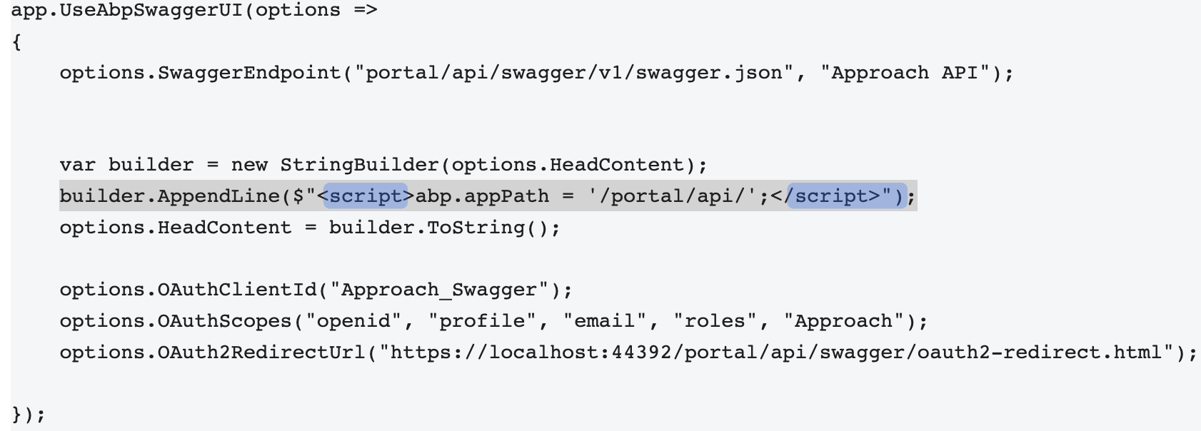 app.UseSwagger(); app.UseAbpSwaggerUI(options => { options.SwaggerEndpoint("/portal/api/swagger/v1/swagger.json", "Approach API"); var builder = new StringBuilder(options.HeadContent); builder.AppendLine($"<myscript>abp.appPath = '/portal/api/';</myscript>"); options.HeadContent = builder.ToString(); var configuration = context.GetConfiguration(); options.OAuthClientId(configuration["AuthServer:SwaggerClientId"]); });Thanks.