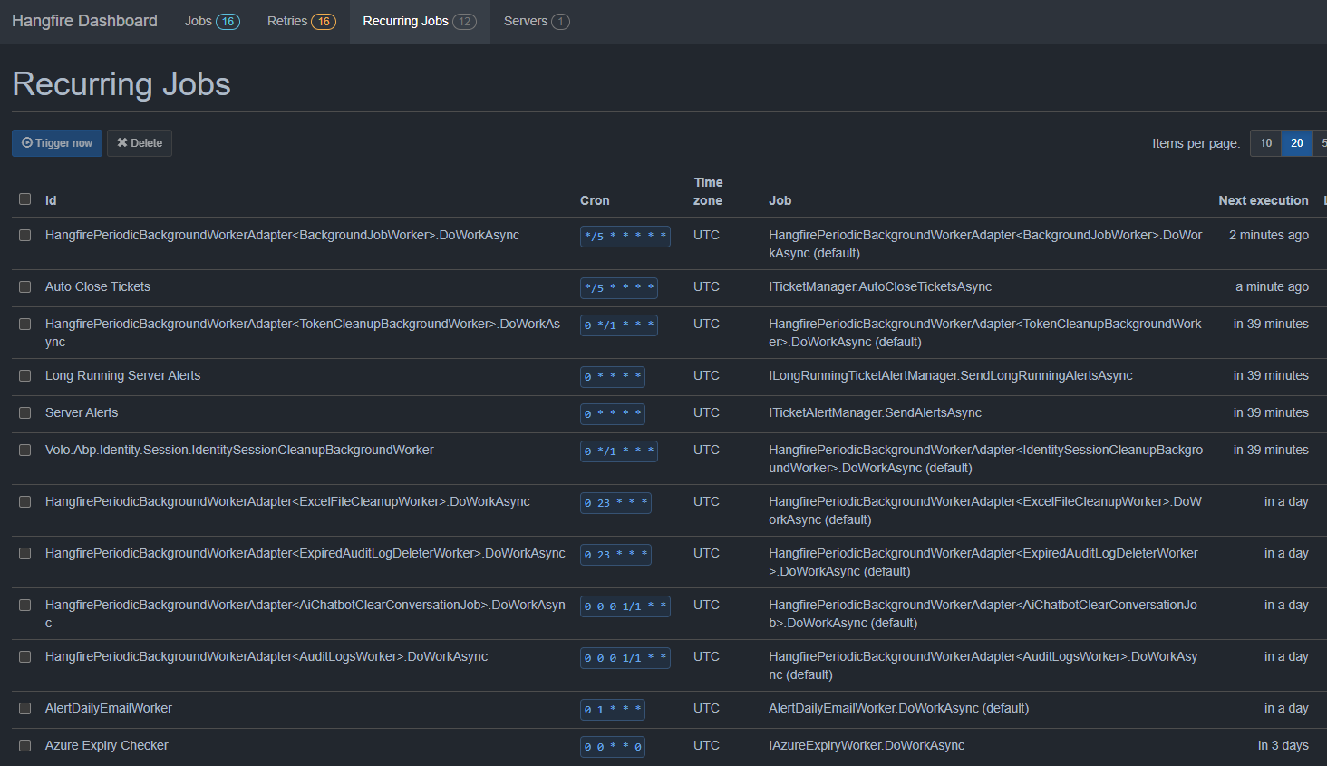 The ABP background workers and jobs have some awful names in the Hangfire dashboard. The Volo.Abp.Identity.Session.IdentitySessionCleanupBackgroundWorker is acceptable to me even if it is a bit long. However, HangfirePeriodicBackgroundWorker<BackgroundJobWork>.DoWorkAsync is simply awful for the recurringJobId. What is the cleanest way to set the name of these recurring jobs to a more user friendly name?