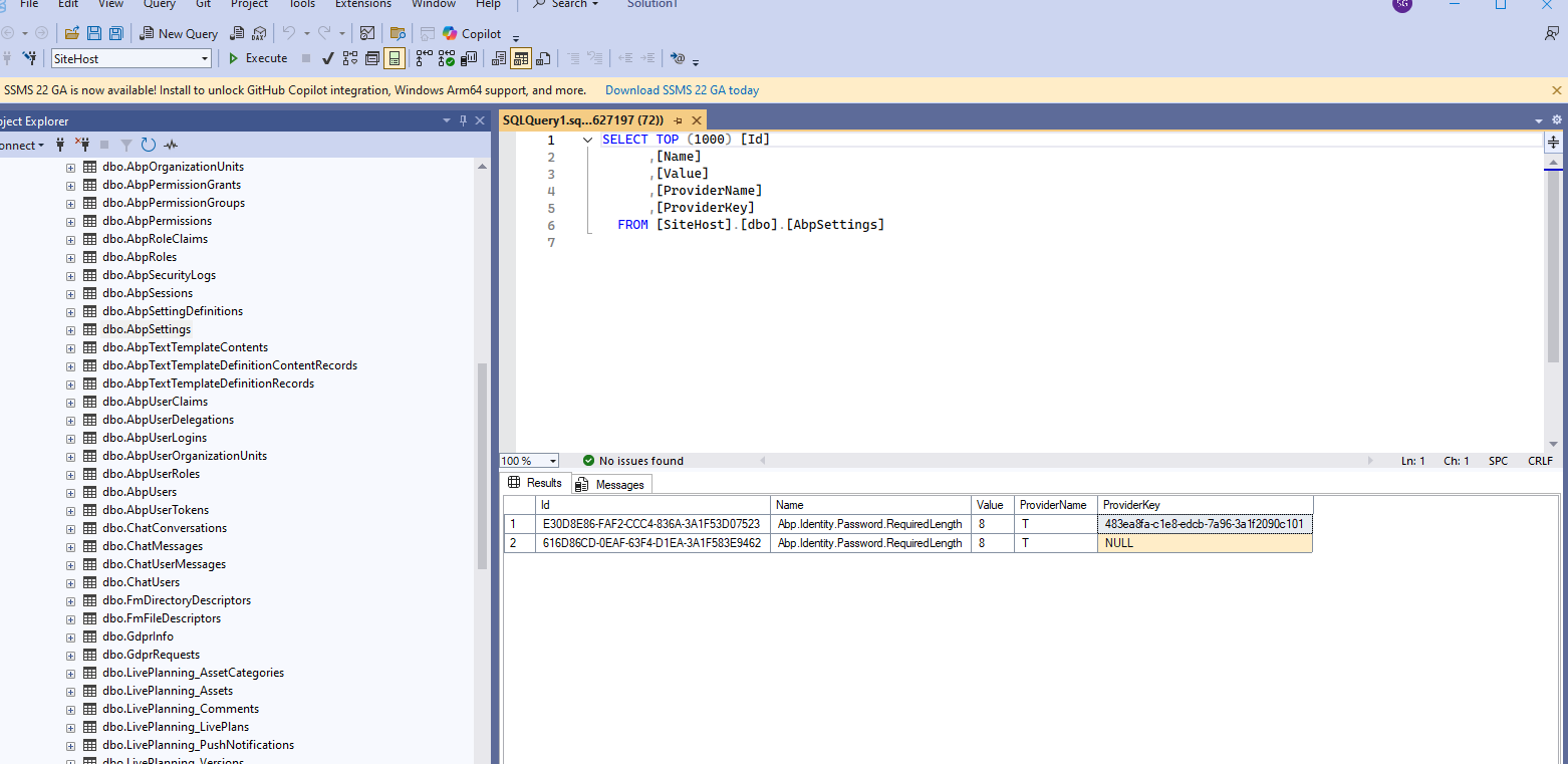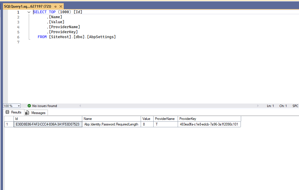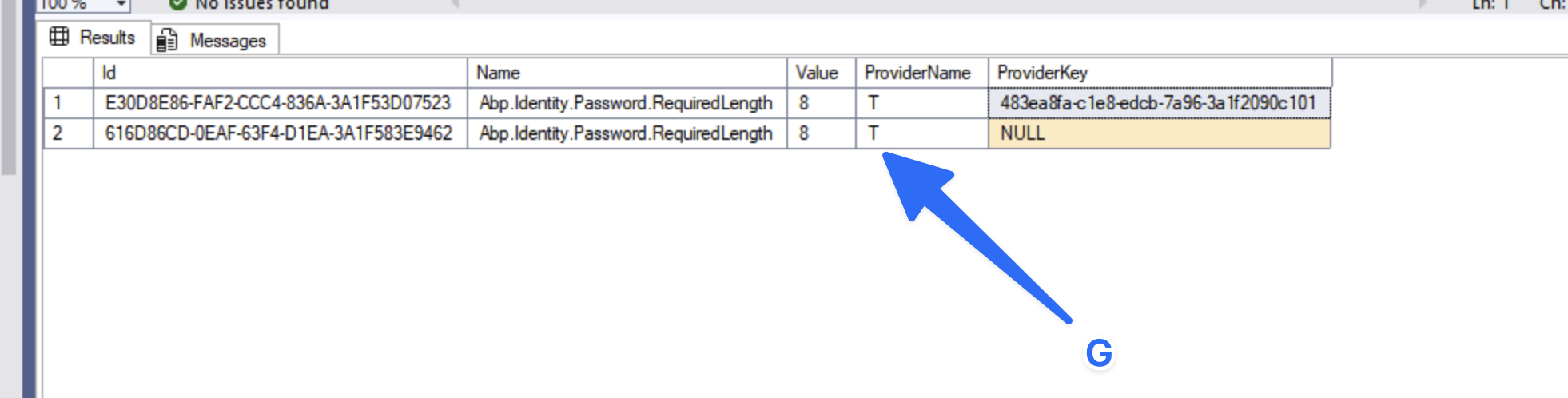 TwithNULLis no problem. You can test again| Id | Name | Value | ProviderName | ProviderKey | |--------------------------------------|----------------------------------------|------|--------------|----------------------------------------| | ED02A171-57B5-1022-232C-3A1F587E0589 | Abp.Identity.Password.RequiredLength | 8 | T | 483ea8fa-cle8-edcb-7a96-3a1f2090c101 | | ED02A171-57B5-1022-232C-3A1F587E0589 | Abp.Identity.Password.RequiredLength | 8 | T | Null |