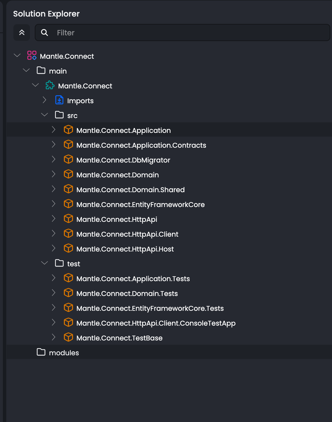 Connect|⇒ pwd /Volumes/Projects/MantleInternational/abpio/mCm/Connect Connect|⇒ tree -L 1 . ├── angular ├── common.props ├── Directory.DotSettings ├── etc ├── Mantle.Connect.abpmdl ├── Mantle.Connect.abpsln ├── Mantle.Connect.slnx ├── NuGet.Config ├── README.md ├── src └── test 5 directories, 7 files Connect|⇒ node -v v22.22.0 Connect|⇒ npm -v 10.9.4 Connect|⇒ yarn -v 1.22.22 Connect|⇒ -