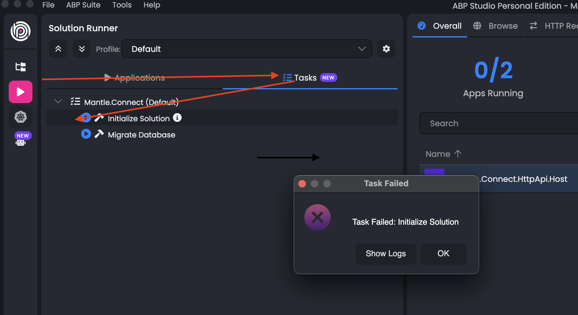 node -vworks) and start ABP Suite from that same Terminal session (so it inherits the environment). - Then re-run Tasks → Initialize Solution.