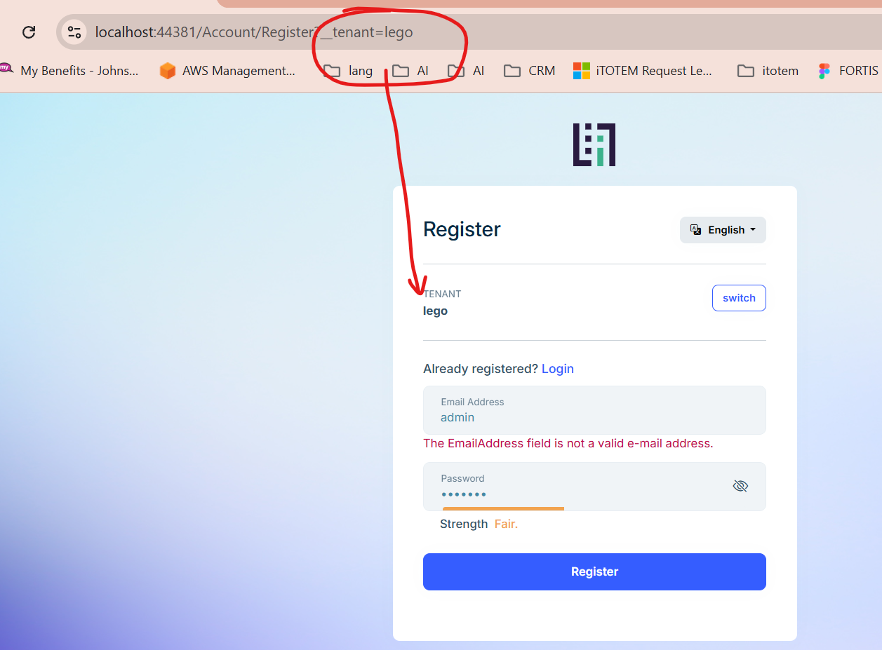 We are trying to add a textbox on the register page, users can put a code in and we will use the code to pick a tenant for them, so instead of using https://localhost:44381/Account/register?__tenant=lego they will just use https://localhost:44381/Account/register and put a code 'lego' on the new textbox and then the code behind will select lego as the tenant how can we do that? thanks
