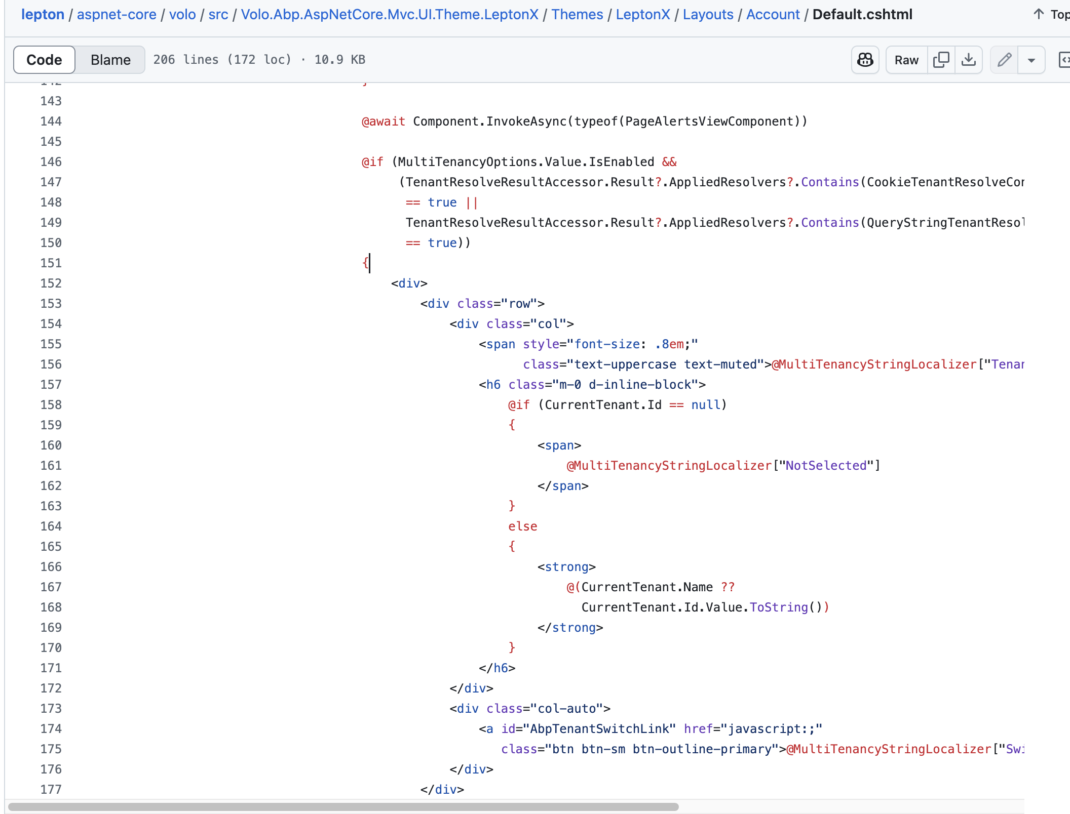 This code comes from the layout of the theme. * I meant the modal, I found it for the mauiblazor , but couldn't find it for the MVC project: <Modal @ref="SwitchTenantModal" Closing="@SwitchTenantModal.CancelClosingModalWhenFocusLost"> <ModalContent Centered="true"> <Form> <ModalHeader> <ModalTitle>@L["SwitchTenant"]</ModalTitle> <CloseButton Clicked="CloseSwitchTenantModalAsync"/> </ModalHeader> <ModalBody> <Field> <FieldLabel>@L["Name"] *</FieldLabel> <TextEdit @bind-Text="TenantName" Autofocus="true"/> <div class="form-text">@L["SwitchTenantHint"]</div> </Field> </ModalBody> <ModalFooter> <Button Color="Color.Secondary" Clicked="CloseSwitchTenantModalAsync">@L["Cancel"]</Button> <SubmitButton Clicked="@SwitchTenantAsync"/> </ModalFooter> </Form> </ModalContent> </Modal>