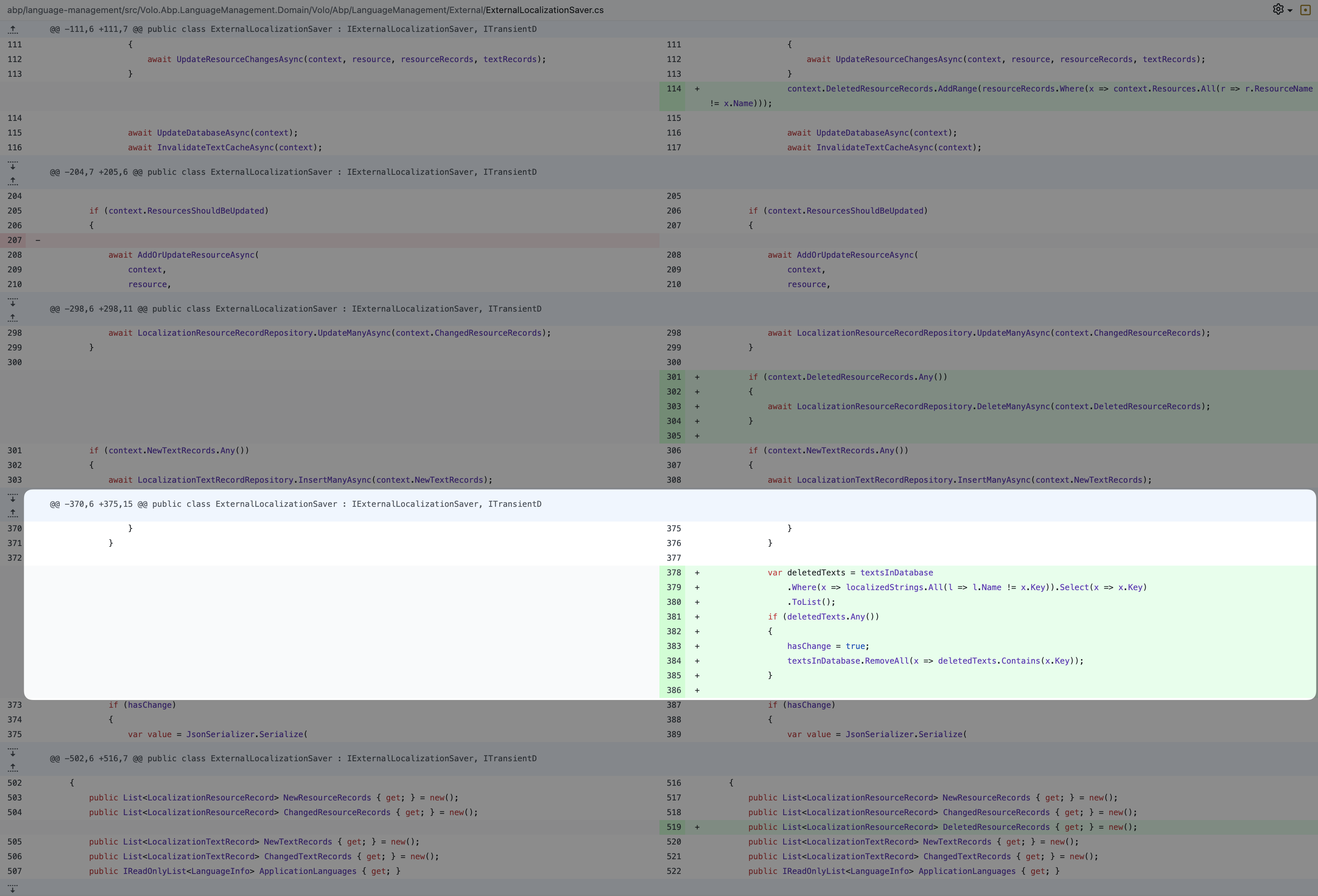 We're trying to hide certain localisations from the users in the frontend and ran into a problem and the eventual cause seems to be the ExternalLocalizationStore service not deleting old localisations from the ExternalLocalizationStore table. We found this out after we deployed a fix to our staging environment that removed a localization key value - however this did not get propagated to the database or the api/abp/application-localization api, meaning we could see the value we wanted to removed in the response.