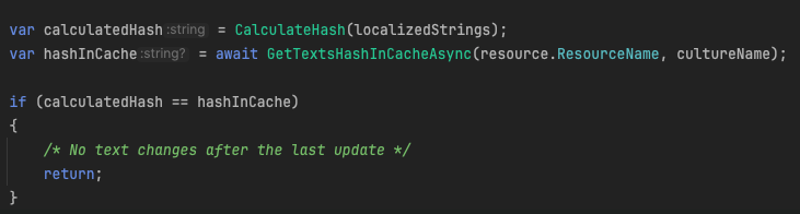 .jsonfile are different so it doesn't exit early from theUpdateResourceTextChangesAsyncmethod. However, because I'm using an older version of theExternalLocalizationSaver, the localizations in the db field do not get deleted. The hash for the resource gets updated into the cache, using the hash calculated from thelocalizedStrings- the raw.jsontext records. When I run step 3 with the newExternalLocalizationSaver, it exits early because the hashes are the same. This means it doesn't delete the old text records from the db field.I've fixed this by clearing the cache between steps 2 and 3 which ensures it does not return early from the