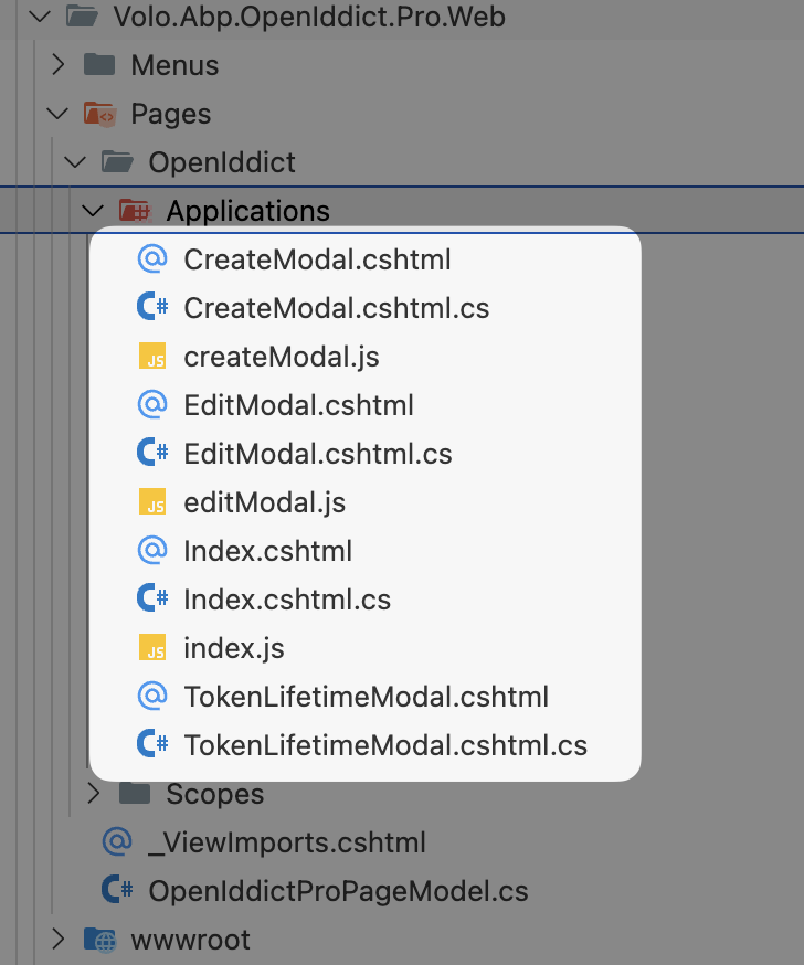 OpenIddict'spagesVolo.Abp.OpenIddict.Pro.Web.Pages.OpenIddict.ApplicationsIndexModelVolo.Abp.OpenIddict.Pro.Web.Pages.OpenIddict.CreateModalVolo.Abp.OpenIddict.Pro.Web.Pages.OpenIddict.EditModalVolo.Abp.OpenIddict.Pro.Web.Pages.OpenIddict.TokenLifetimeModalhttps://abp.io/docs/latest/framework/ui/mvc-razor-pages/customization-user-interface