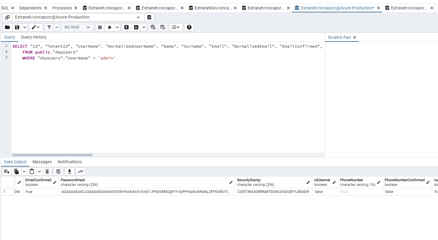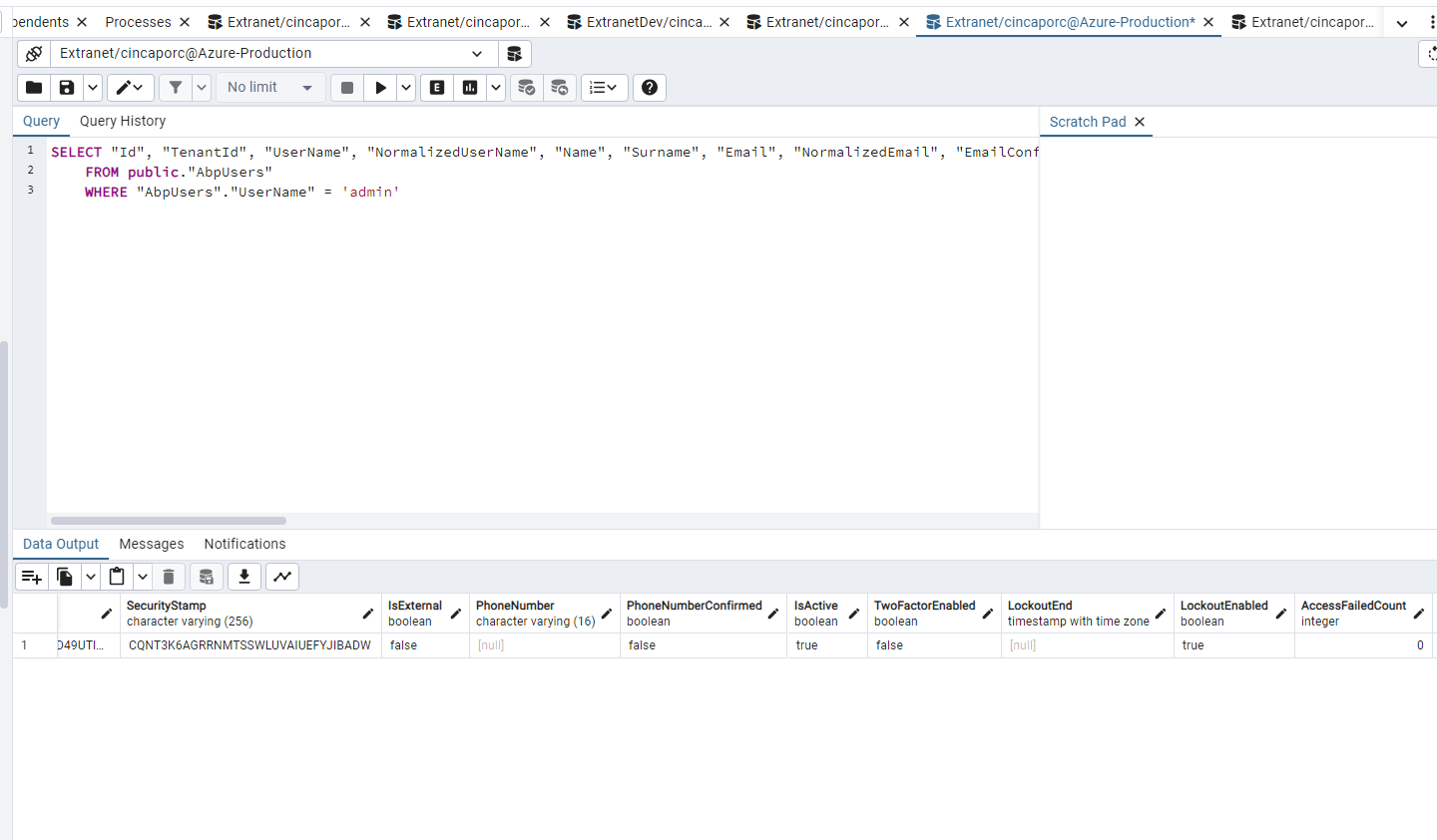 2025-08-18 12:16:02.126 +02:00 [INF] [] [] Request finished HTTP/1.1 GET https://extranetidentity-dev.cincaporc.com/Abp/ServiceProxyScript - - - 200 162 application/javascript 4.4570ms 2025-08-18 12:16:02.130 +02:00 [INF] [] [] Request finished HTTP/1.1 GET https://extranetidentity-dev.cincaporc.com/Abp/ApplicationConfigurationScript - - - 200 207586 application/javascript 20.4688ms 2025-08-18 12:16:02.976 +02:00 [INF] [] [] Request starting HTTP/1.1 POST https://extranetidentity-dev.cincaporc.com/Account/Login application/x-www-form-urlencoded 320 2025-08-18 12:16:02.976 +02:00 [INF] [] [] CORS policy execution successful. 2025-08-18 12:16:02.978 +02:00 [INF] [null] [null] Executing endpoint '/Account/Login' 2025-08-18 12:16:02.978 +02:00 [INF] [null] [null] Route matched with {page = "/Account/Login", area = "", action = "", controller = ""}. Executing page /Account/Login 2025-08-18 12:16:02.978 +02:00 [INF] [null] [null] Skipping the execution of current filter as its not the most effective filter implementing the policy Microsoft.AspNetCore.Mvc.ViewFeatures.IAntiforgeryPolicy 2025-08-18 12:16:02.984 +02:00 [INF] [null] [null] Executing handler method Cincaporc.WebApp.Pages.Account.CustomLoginModel.OnPostAsync - ModelState is "Valid" 2025-08-18 12:16:02.984 +02:00 [INF] [null] [null] Executed handler method OnPostAsync, returned result Microsoft.AspNetCore.Mvc.RazorPages.PageResult. 2025-08-18 12:16:02.990 +02:00 [INF] [null] [null] Executed page /Account/Login in 11.1833ms 2025-08-18 12:16:02.990 +02:00 [INF] [null] [null] Executed endpoint '/Account/Login' 2025-08-18 12:16:02.990 +02:00 [INF] [null] [null] Entity Framework Core 6.0.5 initialized 'AbpAuditLoggingDbContext' using provider 'Npgsql.EntityFrameworkCore.PostgreSQL:6.0.2+854d2438884c0bf3a4ba8ccde2c47f7ba1ea3a4c' with options: QuerySplittingBehavior=SplitQuery 2025-08-18 12:16:02.996 +02:00 [INF] [null] [null] Executed DbCommand (4ms) [Parameters=[@p0='?' (DbType = Guid), @p1='?', @p2='?', @p3='?', @p4='?', @p5='?', @p6='?', @p7='?', @p8='?', @p9='?', @p10='?' (DbType = Int32), @p11='?' (DbType = DateTime), @p12='?', @p13='?', @p14='?' (DbType = Int32), @p15='?' (DbType = Guid), @p16='?', @p17='?' (DbType = Guid), @p18='?', @p19='?' (DbType = Guid), @p20='?', @p21='?', @p22='?' (DbType = Guid), @p23='?'], CommandType='"Text"', CommandTimeout='30'] INSERT INTO "AbpAuditLogs" ("Id", "ApplicationName", "BrowserInfo", "ClientId", "ClientIpAddress", "ClientName", "Comments", "ConcurrencyStamp", "CorrelationId", "Exceptions", "ExecutionDuration", "ExecutionTime", "ExtraProperties", "HttpMethod", "HttpStatusCode", "ImpersonatorTenantId", "ImpersonatorTenantName", "ImpersonatorUserId", "ImpersonatorUserName", "TenantId", "TenantName", "Url", "UserId", "UserName") VALUES (@p0, @p1, @p2, @p3, @p4, @p5, @p6, @p7, @p8, @p9, @p10, @p11, @p12, @p13, @p14, @p15, @p16, @p17, @p18, @p19, @p20, @p21, @p22, @p23); 2025-08-18 12:16:03.001 +02:00 [INF] [] [] Request finished HTTP/1.1 POST https://extranetidentity-dev.cincaporc.com/Account/Login application/x-www-form-urlencoded 320 - 200 - text/html;+charset=utf-8 24.8417ms 2025-08-18 12:16:03.052 +02:00 [INF] [] [] Request starting HTTP/1.1 GET https://extranetidentity-dev.cincaporc.com/Abp/ApplicationConfigurationScript - - 2025-08-18 12:16:03.054 +02:00 [INF] [null] [null] Executing endpoint 'Volo.Abp.AspNetCore.Mvc.ApplicationConfigurations.AbpApplicationConfigurationScriptController.Get (Volo.Abp.AspNetCore.Mvc)' 2025-08-18 12:16:03.055 +02:00 [INF] [null] [null] Route matched with {area = "Abp", action = "Get", controller = "AbpApplicationConfigurationScript", page = ""}. Executing controller action with signature System.Threading.Tasks.Task`1[Microsoft.AspNetCore.Mvc.ActionResult] Get() on controller Volo.Abp.AspNetCore.Mvc.ApplicationConfigurations.AbpApplicationConfigurationScriptController (Volo.Abp.AspNetCore.Mvc). 2025-08-18 12:16:03.055 +02:00 [INF] [] [] Request starting HTTP/1.1 GET https://extranetidentity-dev.cincaporc.com/Abp/ServiceProxyScript - - 2025-08-18 12:16:03.057 +02:00 [INF] [null] [null] Executing endpoint 'Volo.Abp.AspNetCore.Mvc.ProxyScripting.AbpServiceProxyScriptController.GetAll (Volo.Abp.AspNetCore.Mvc)' 2025-08-18 12:16:03.057 +02:00 [INF] [null] [null] Route matched with {area = "Abp", action = "GetAll", controller = "AbpServiceProxyScript", page = ""}. Executing controller action with signature Microsoft.AspNetCore.Mvc.ActionResult GetAll(Volo.Abp.AspNetCore.Mvc.ProxyScripting.ServiceProxyGenerationModel) on controller Volo.Abp.AspNetCore.Mvc.ProxyScripting.AbpServiceProxyScriptController (Volo.Abp.AspNetCore.Mvc). 2025-08-18 12:16:03.058 +02:00 [INF] [null] [null] Executing ContentResult with HTTP Response ContentType of application/javascript 2025-08-18 12:16:03.059 +02:00 [INF] [null] [null] Executed action Volo.Abp.AspNetCore.Mvc.ProxyScripting.AbpServiceProxyScriptController.GetAll (Volo.Abp.AspNetCore.Mvc) in 1.7031ms 2025-08-18 12:16:03.059 +02:00 [INF] [null] [null] Executed endpoint 'Volo.Abp.AspNetCore.Mvc.ProxyScripting.AbpServiceProxyScriptController.GetAll (Volo.Abp.AspNetCore.Mvc)' 2025-08-18 12:16:03.059 +02:00 [INF] [] [] Request finished HTTP/1.1 GET https://extranetidentity-dev.cincaporc.com/Abp/ServiceProxyScript - - - 200 162 application/javascript 4.0101ms 2025-08-18 12:16:03.065 +02:00 [INF] [null] [null] Executing ContentResult with HTTP Response ContentType of application/javascript 2025-08-18 12:16:03.066 +02:00 [INF] [null] [null] Executed action Volo.Abp.AspNetCore.Mvc.ApplicationConfigurations.AbpApplicationConfigurationScriptController.Get (Volo.Abp.AspNetCore.Mvc) in 11.4032ms 2025-08-18 12:16:03.066 +02:00 [INF] [null] [null] Executed endpoint 'Volo.Abp.AspNetCore.Mvc.ApplicationConfigurations.AbpApplicationConfigurationScriptController.Get (Volo.Abp.AspNetCore.Mvc)' 2025-08-18 12:16:03.072 +02:00 [INF] [] [] Request finished HTTP/1.1 GET https://extranetidentity-dev.cincaporc.com/Abp/ApplicationConfigurationScript - - - 200 2