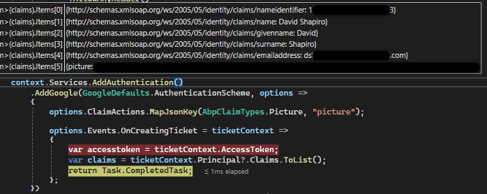 .context.Services.AddAuthentication() .AddGoogle(GoogleDefaults.AuthenticationScheme, options => { options.Events.OnCreatingTicket = ticketContext => { var accesstoken = ticketContext.AccessToken; var claims = ticketContext.Principal?.Claims.ToList(); return Task.CompletedTask; }; // options.ClaimActions.MapJsonKey(AbpClaimTypes.Email, "your_google_email_claim_key"); // options.ClaimActions.MapJsonKey(AbpClaimTypes.UserName, :"your_google_username_claim_key"); // options.ClaimActions.MapJsonKey(AbpClaimTypes.Name, "your_google_username_claim_key"); })