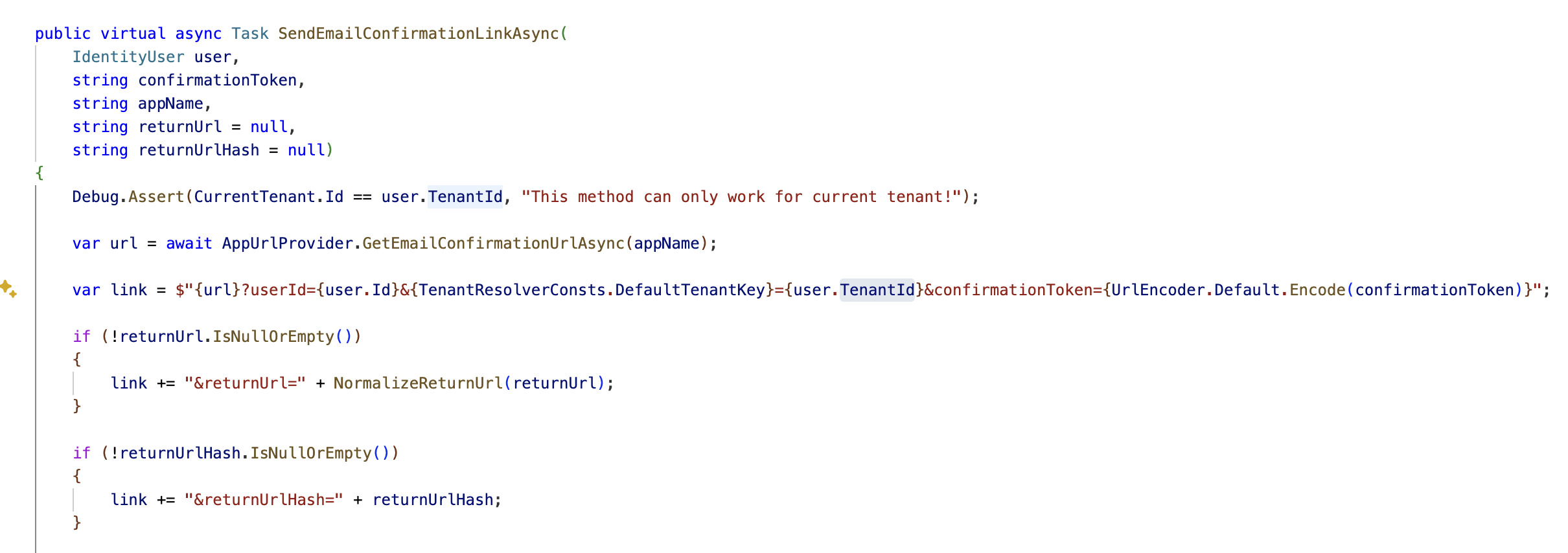 1 optionsAction) 2025-09-25T16:27:51.313151609Z at CloverleafCMS.AuthServer.Program.Main(String[] args) in D:\CodeRepositories\CloverleafCMS-Microservices-Abp\apps\auth-server\CloverleafCMS.AuthServer\Program.cs:line 58I realize the {0} in the uri make it not a FQDN and that is the error - not parsing. So how do I get the correct tenant from the Email Confirmation link?