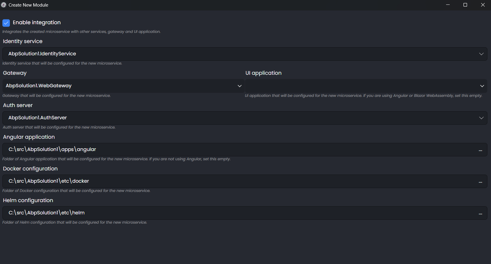 - Create Command: abp new AbpSolution3 -t microservice --ui-framework angular --database-provider ef --database-management-system postgresql --theme leptonx --skip-migrator --public-website --without-cms-kit --dont-run-bundling -no-file-management -no-language-management