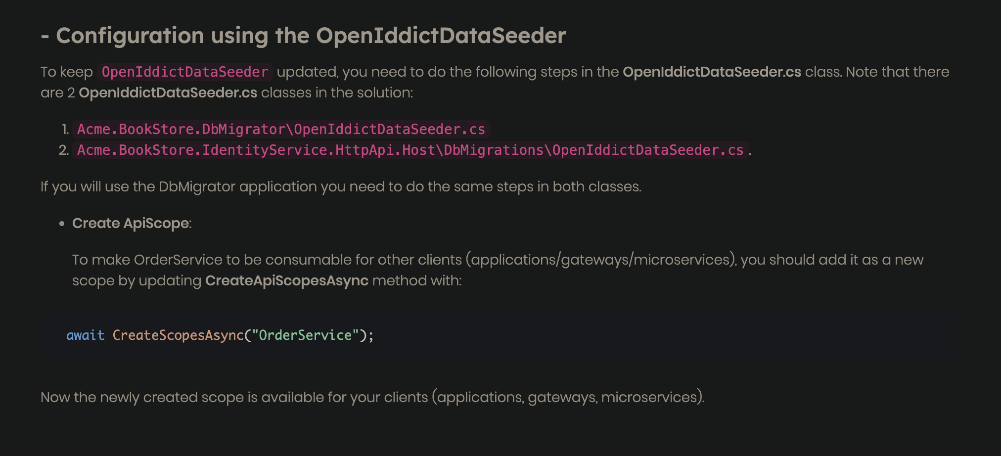 private async Task CreateScopesAsync() { if (await _scopeManager.FindByNameAsync("MyProjectName") == null) { await _scopeManager.CreateAsync(new OpenIddictScopeDescriptor { Name = "MyProjectName", DisplayName = "MyProjectName API", Resources = { "MyProjectName" } }); } }