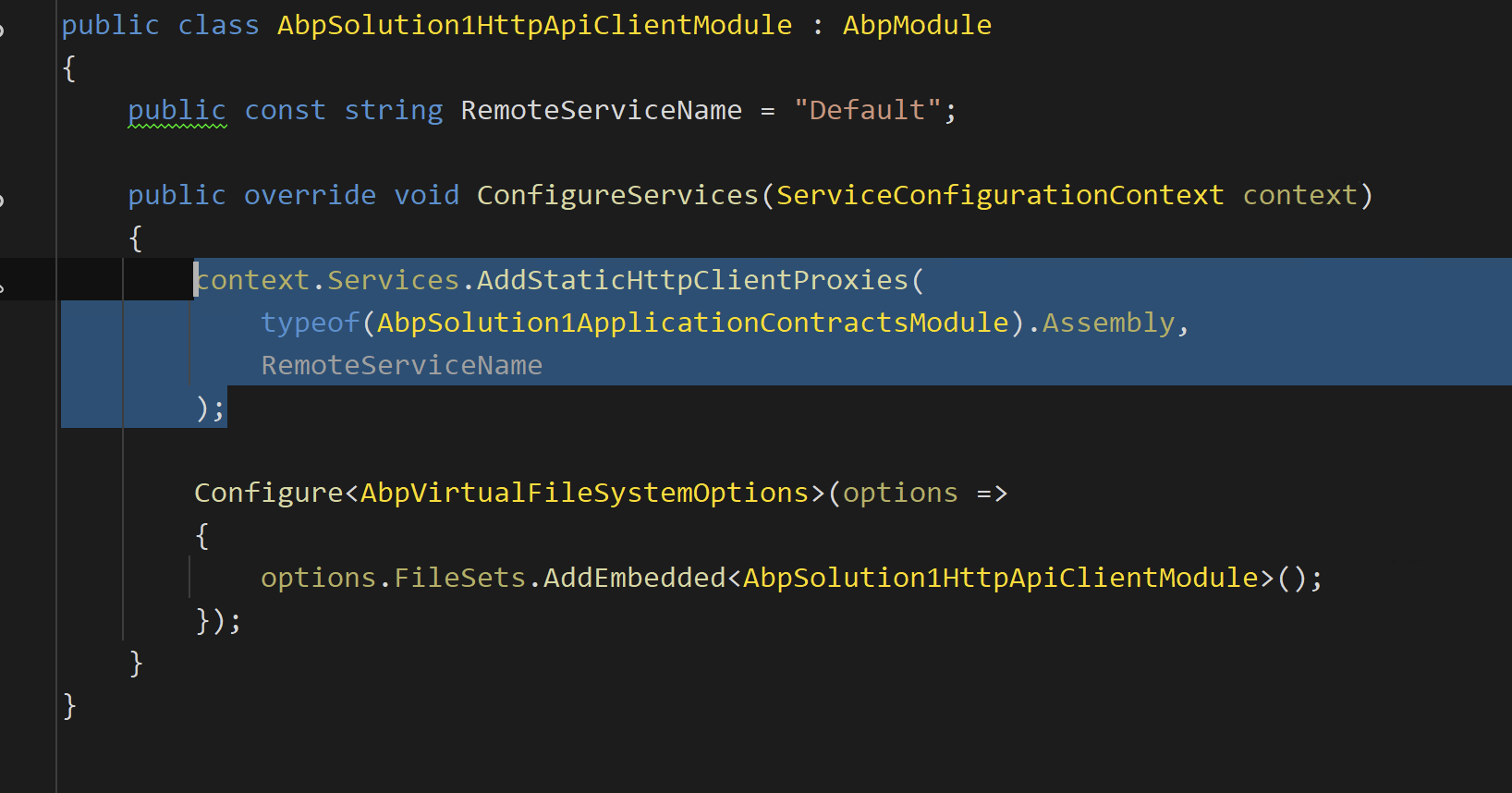 project,context.Services.AddStaticHttpClientProxies( typeof(AbpSolution1ApplicationContractsModule).Assembly, RemoteServiceName );