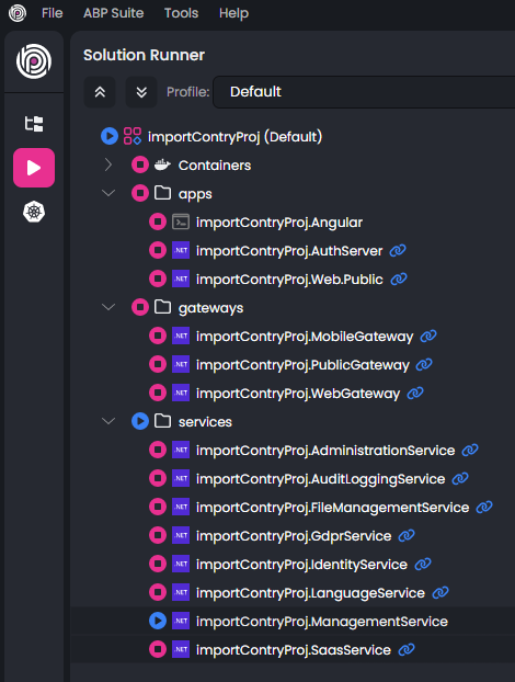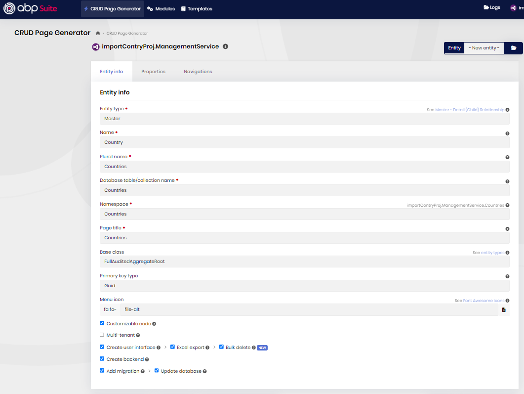 - Create Command: abp new importContryProj -t microservice --ui-framework angular --mobile react-native --database-provider ef --database-management-system postgresql --theme leptonx --skip-migrator --public-website --without-cms-kit --dont-run-bundling -no-language-management -file-management