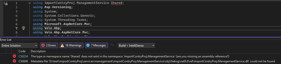 The error occurs because ABP Suite is generating a using importContryProj.ManagementService.Shared; statement, but there is no Shared project or namespace in your microservice solution. In ABP microservice templates, the "Shared" project is not created by default for each service; it is only present in some monolithic or modular setups.