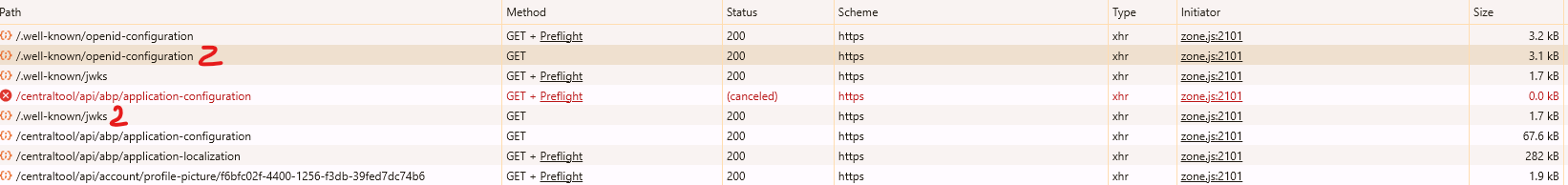 /api/abp/application-configurationrequests you observe are typically caused by the browser or frontend framework (Angular) making multiple requests in quick succession, often due to application initialization logic or HTTP interceptors. In ABP Angular applications, this endpoint is called on startup to load configuration and localization data.The cancellation and duplication can also occur if a previous request is superseded by a new one before the first completes, or if the user navigates quickly, causing Angular to re-initialize services. The log shows a