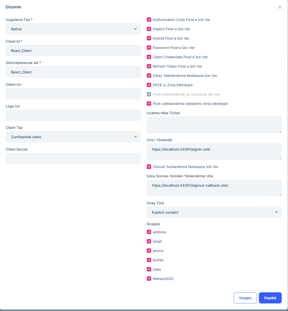, etc.). - The client (React_Client) must be allowed to request the API resource's scope.
